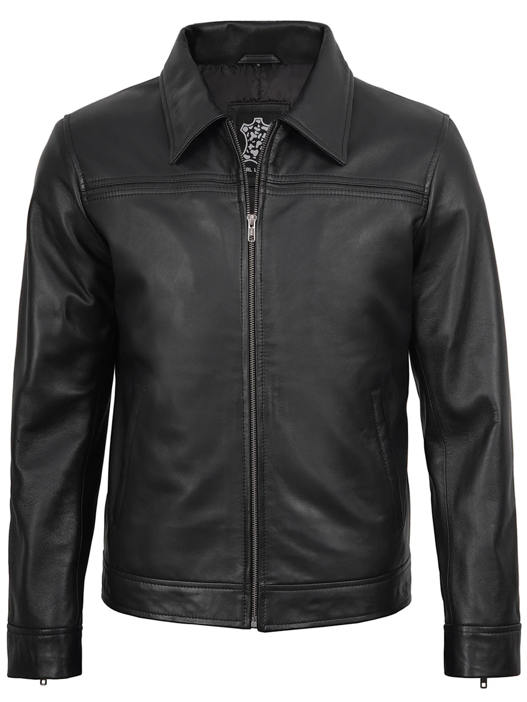Classic men's black lambskin leather jacket with a sharp shirt collar and reliable zip closure. Features practical outer pockets and a tailored fit that works for casual wear or evening occasions.