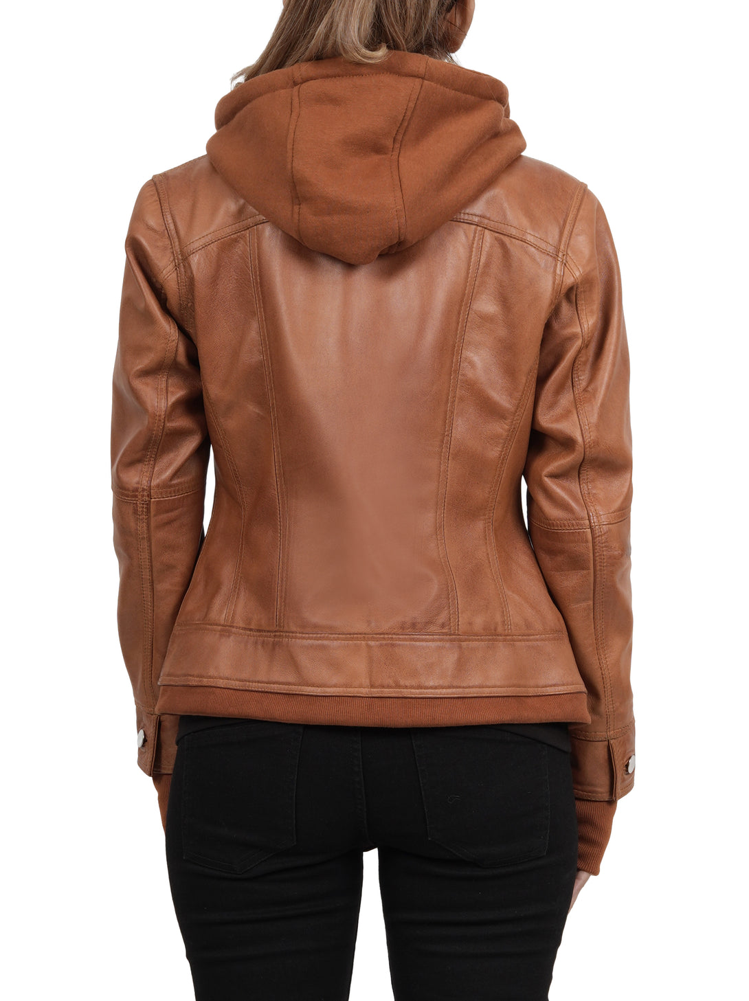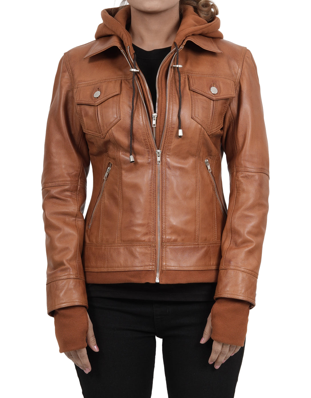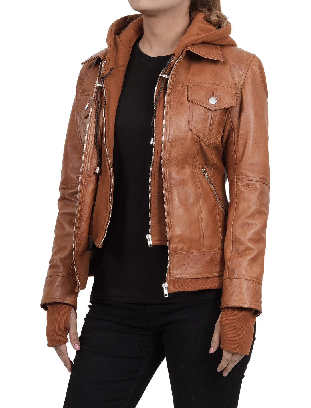 Tralee Womens Tan Wax Bomber Leather Jacket With Removable Hood
