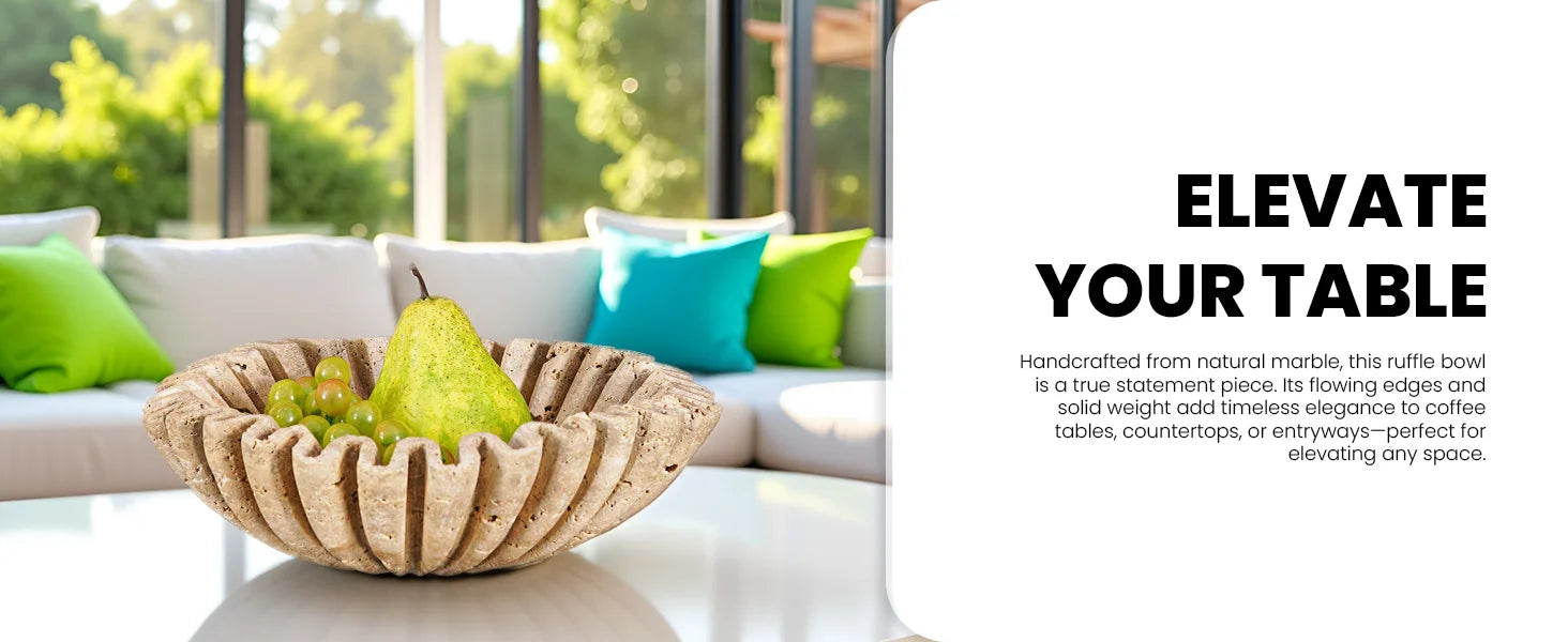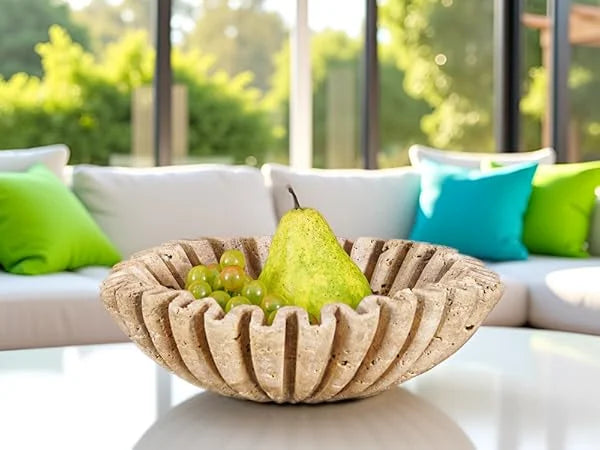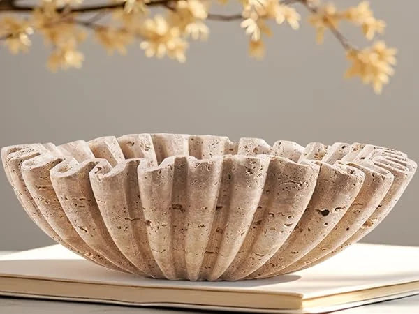 Elevate your home décor with the Travertine Marble Decorative Bowl, handcrafted from solid natural stone. Featuring an elegant ruffle and scalloped design, this bowl highlights the organic beauty of travertine with its unique textures and natural pores. Perfect as a dining table centerpiece, kitchen counter fruit bowl, or entryway accent. A timeless blend of artistry and functionality that complements both modern and classic interiors.
