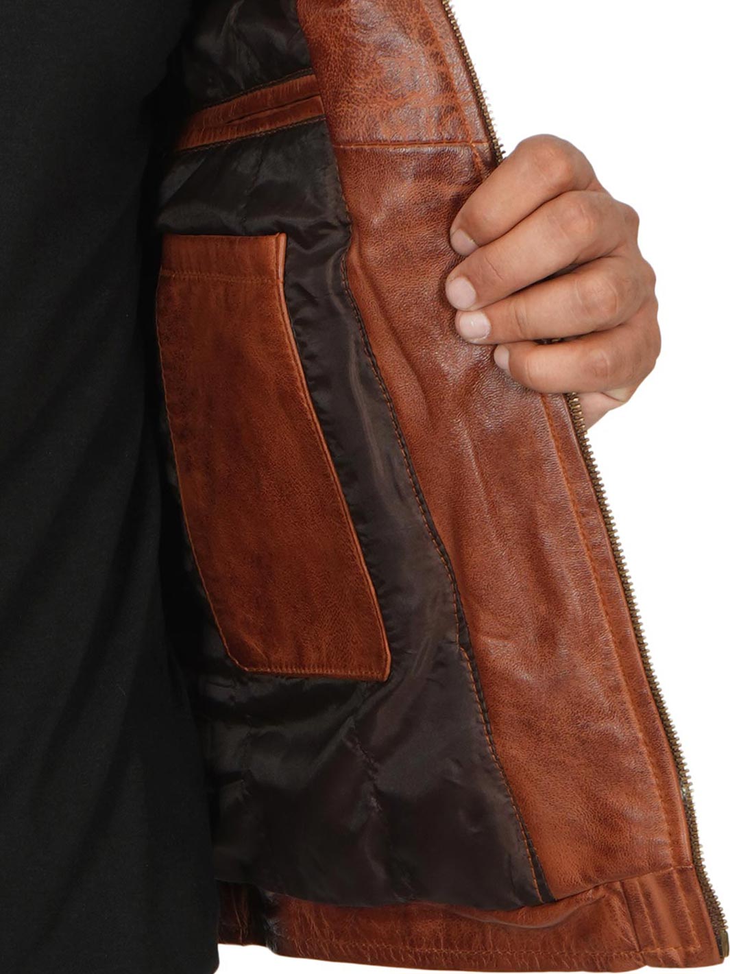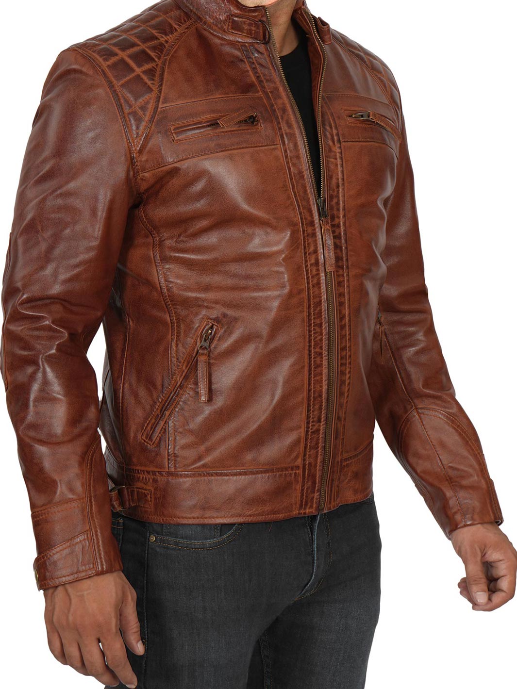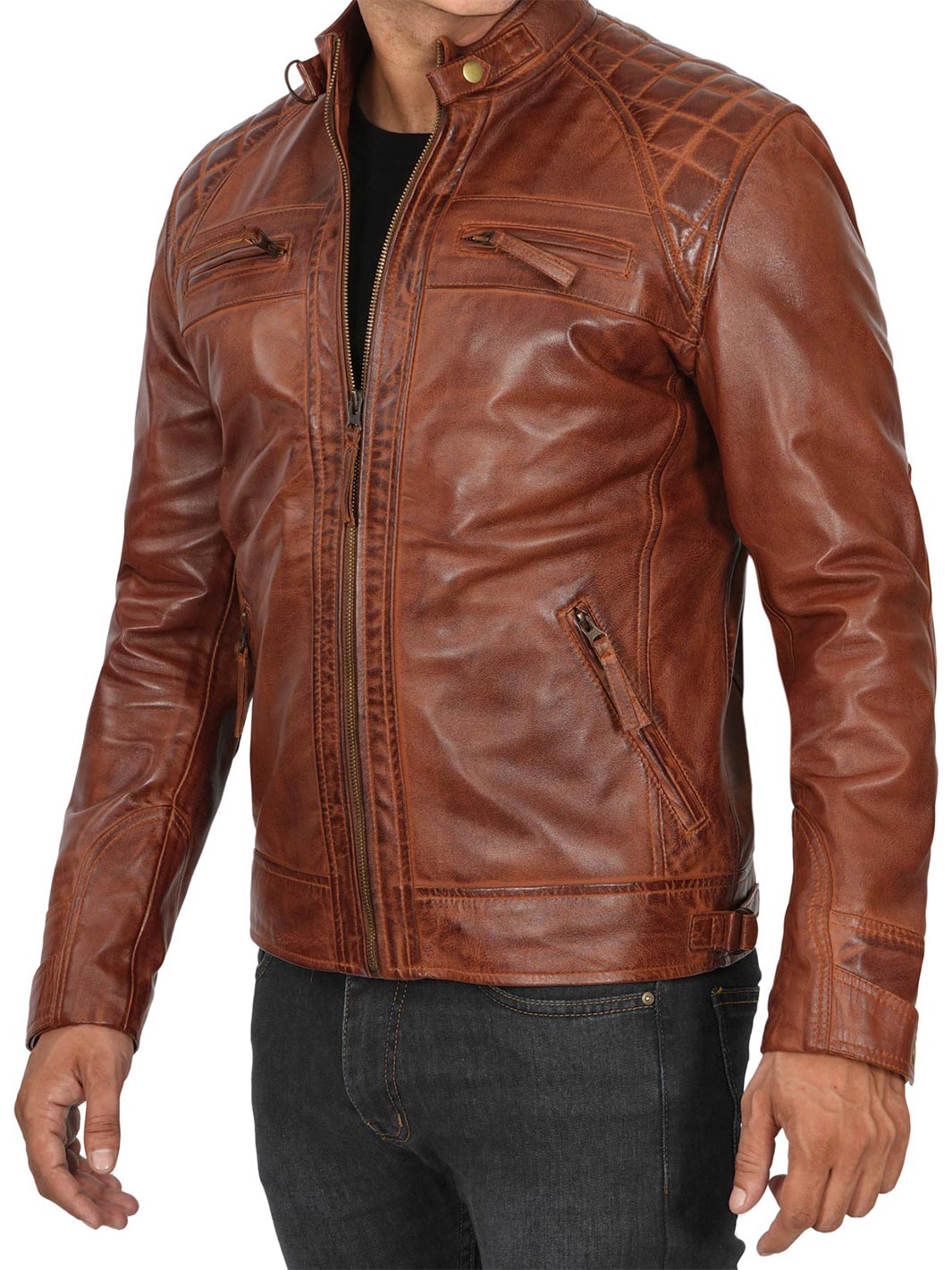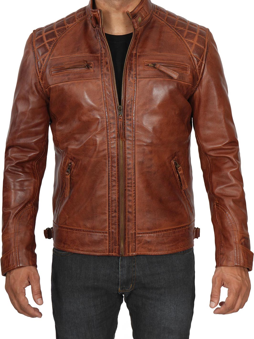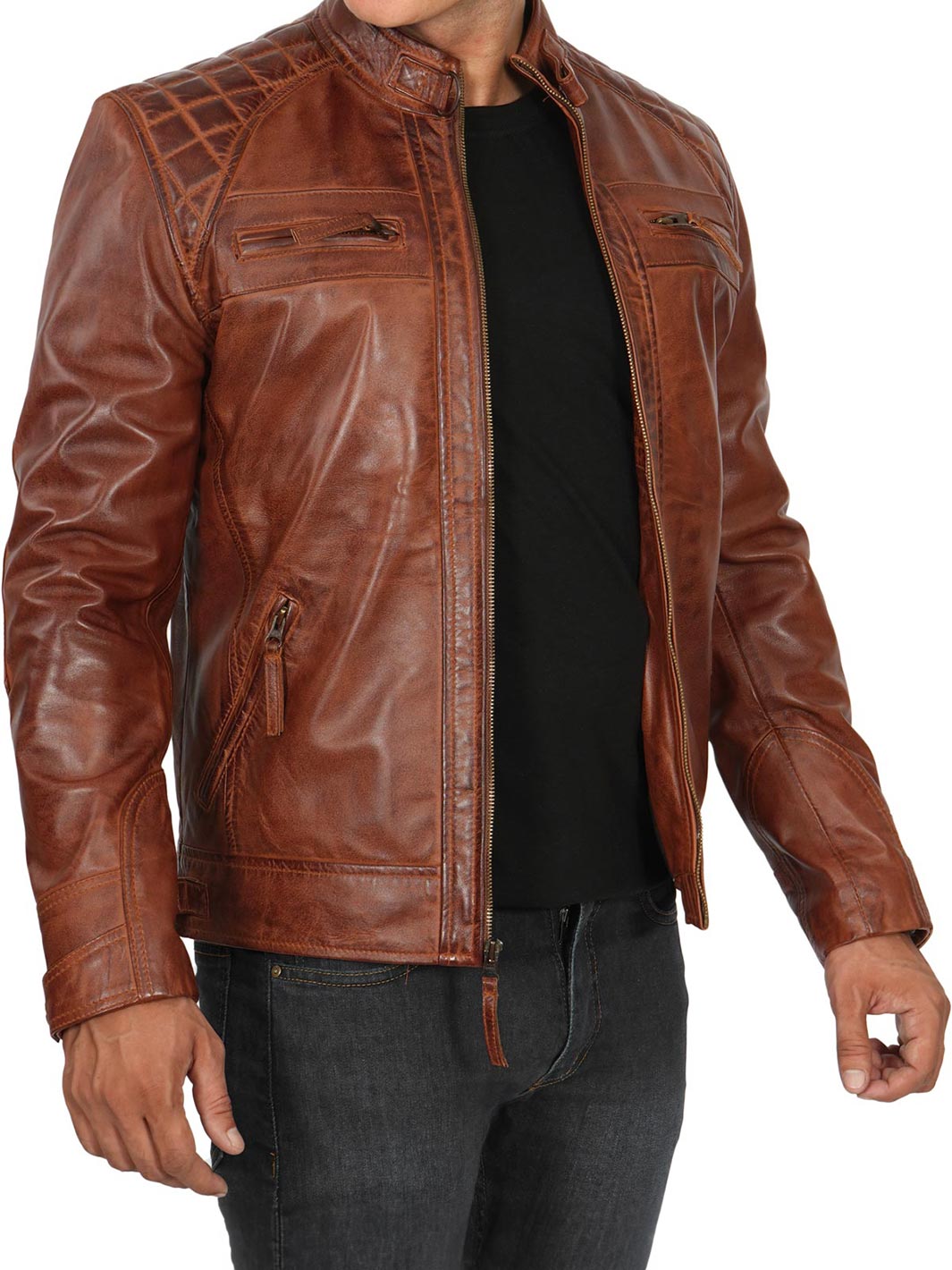 Men’s Cognac Brown Quilted Leather Style Biker Jacket