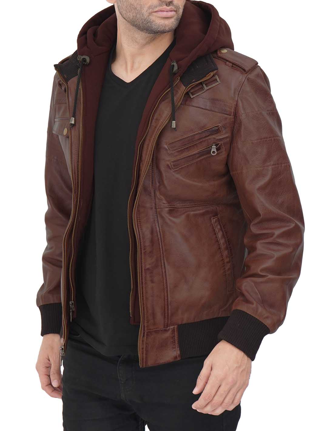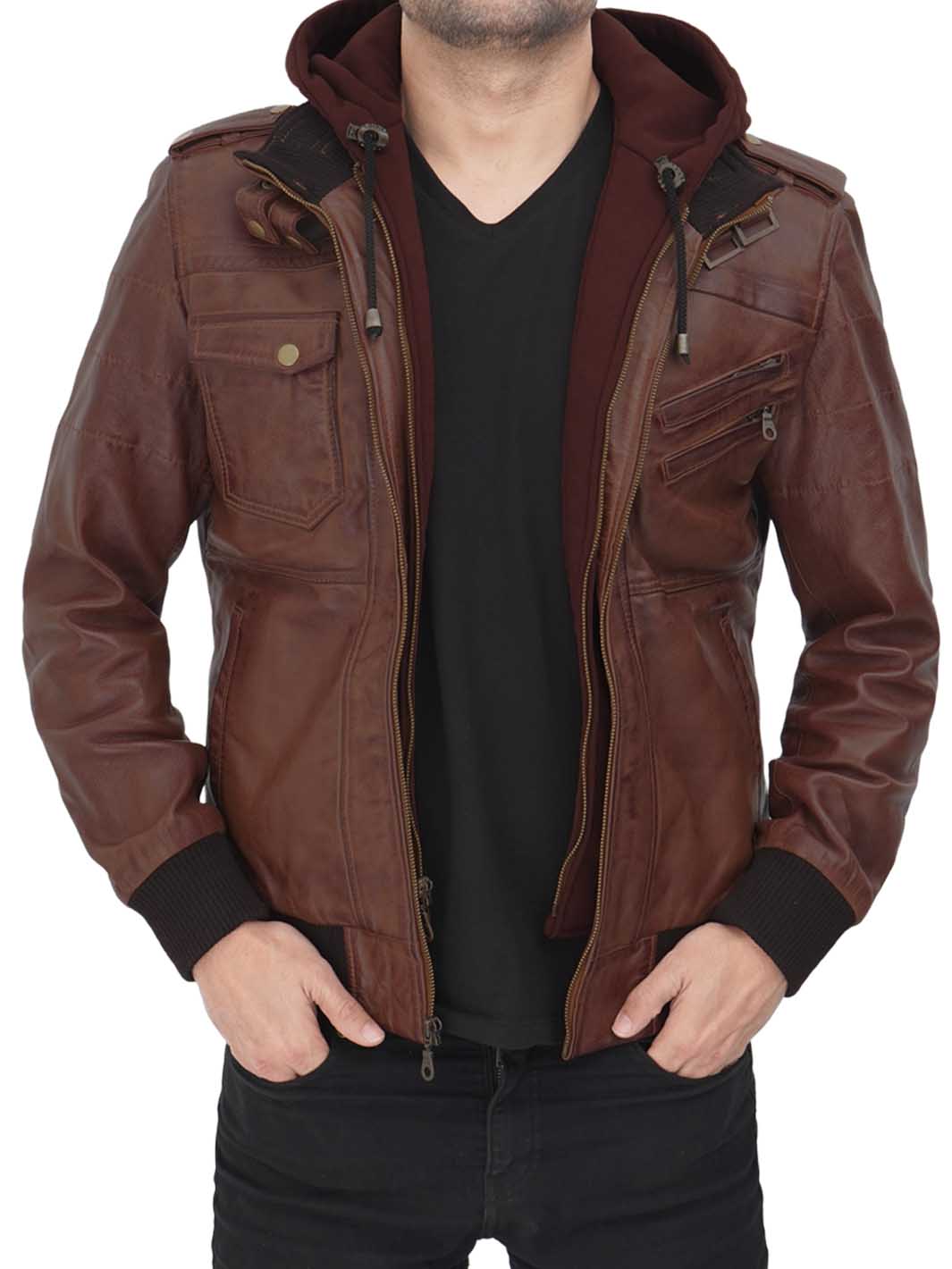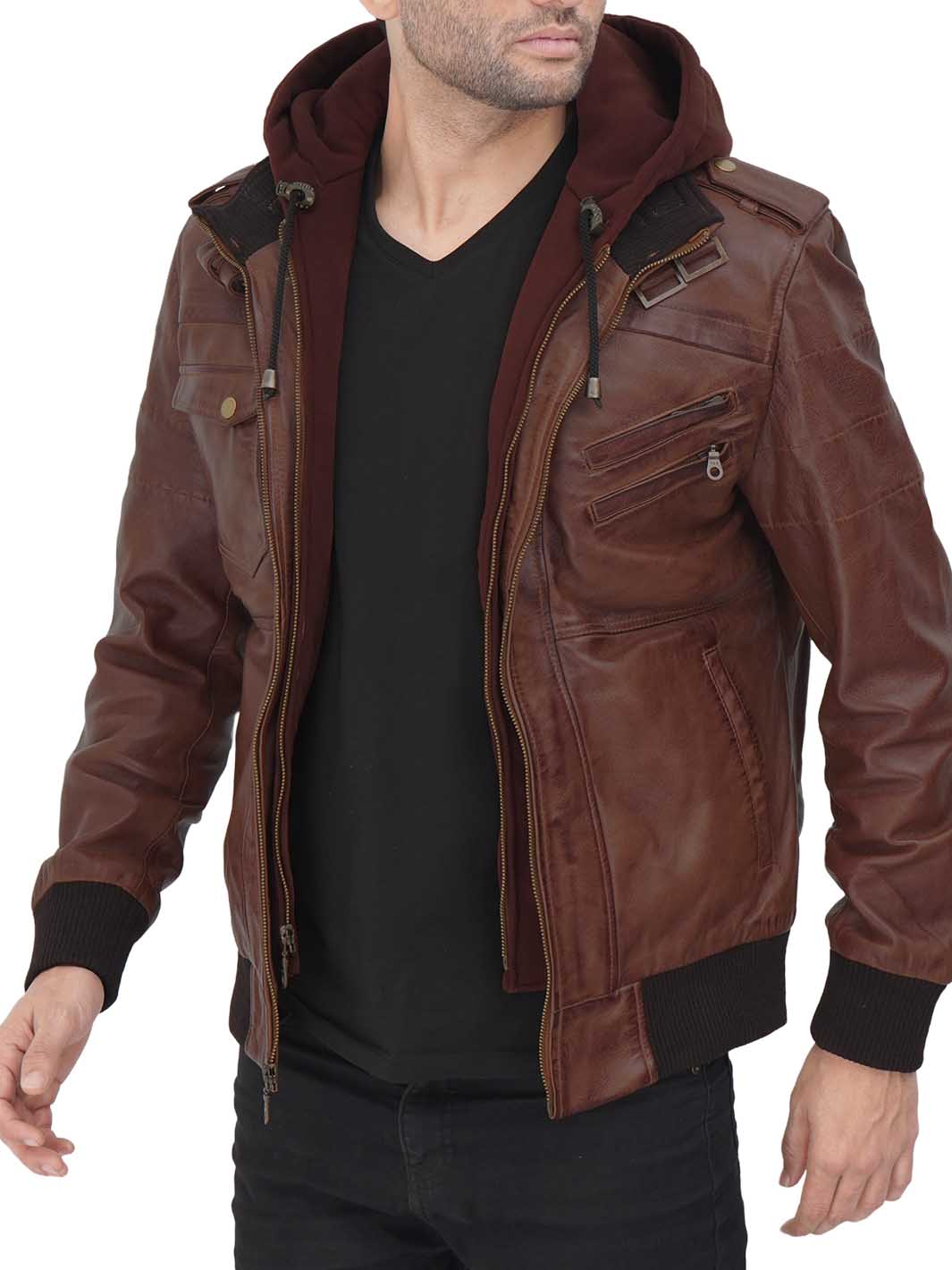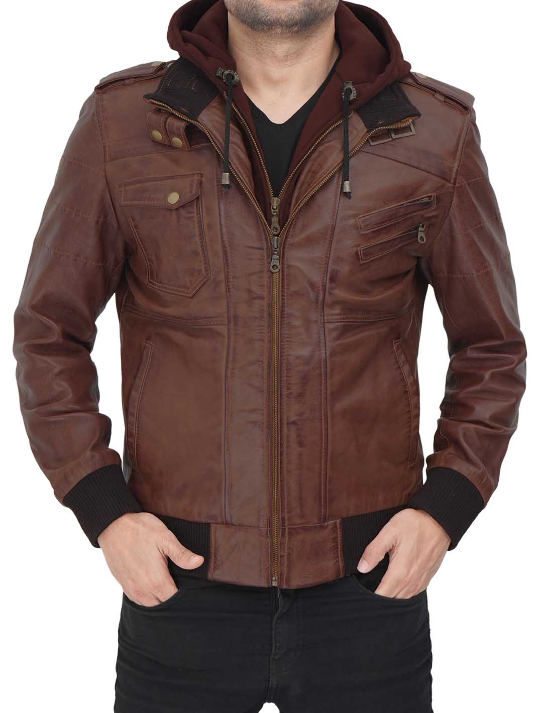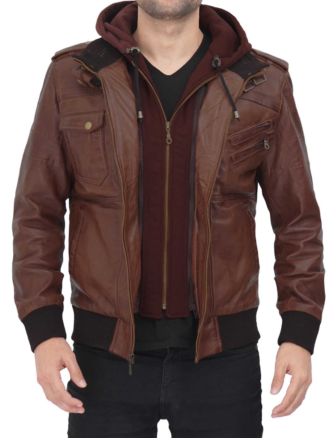 The Edinburgh Men's Bomber Dark Brown Leather Jacket with Removable Hood is a fusion of contemporary style and versatile functionality. It is designed to meet the demands of the modern man, providing a perfect blend of urban fashion and rugged utility.