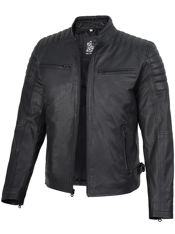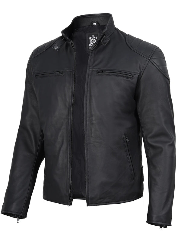 Men’s Real Leather Cafe Racer Jacket with Padded Shoulders