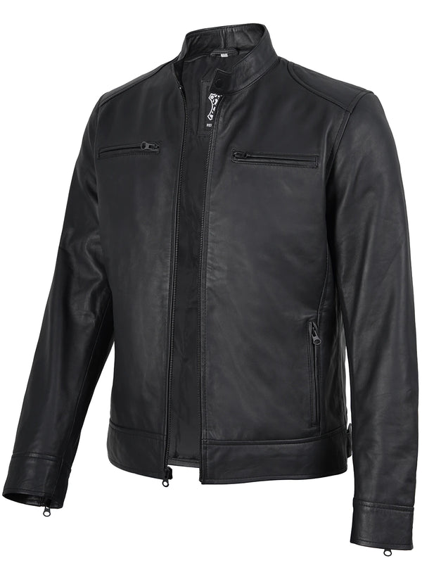 Dodge Men's Matte Black Cafe Racer Style Leather Jacket