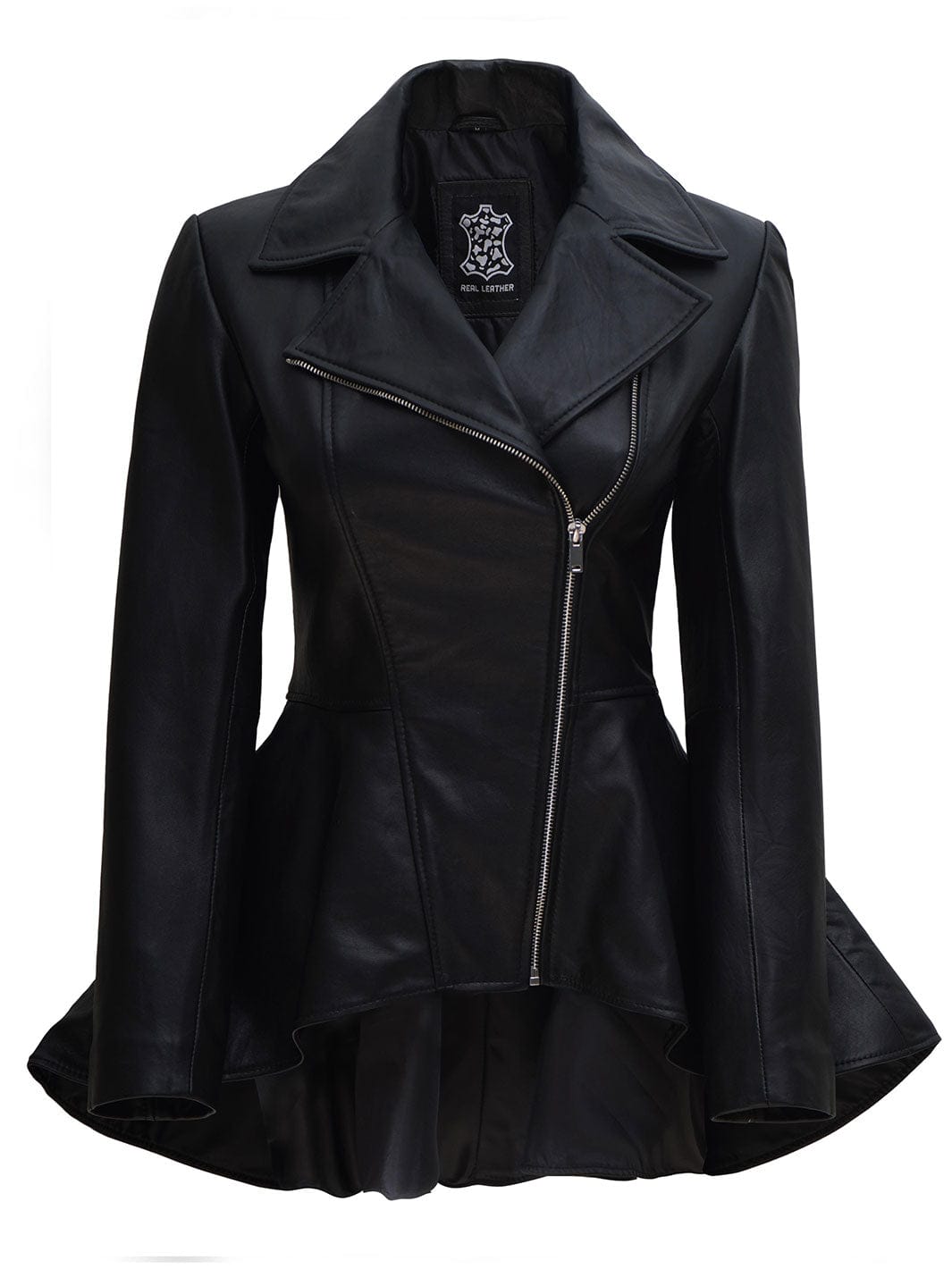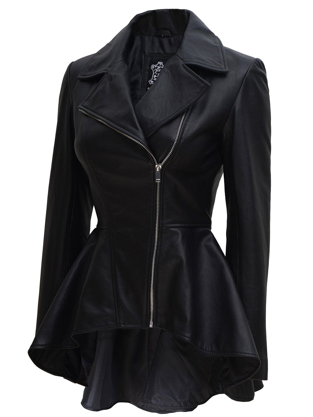 Turn heads with the Clarissa black peplum leather jacket, crafted from 100% real lambskin. The flattering peplum waist and sleek asymmetrical zip closure blend bold biker edge with feminine silhouette for everyday glamour.