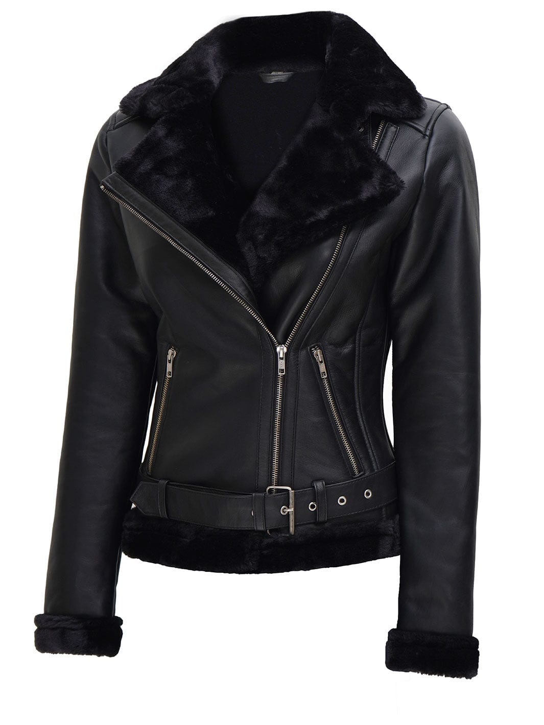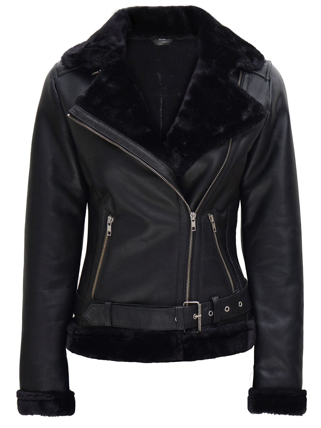 Take on winter in style with this women's black leather shearling jacket, designed in a classic aviator silhouette. Crafted from real lambskin leather, it features faux fur lining, a double belted collar, and zippered pockets for everyday convenience. A warm and bold outerwear choice for chilly days.