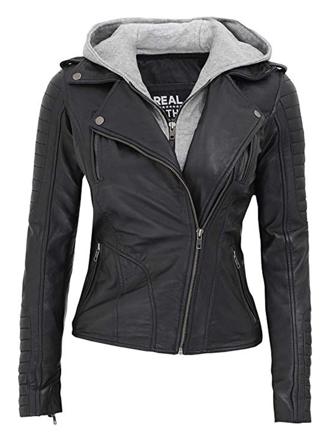 Womens Black Leather Biker Style Jacket With Removable Hood