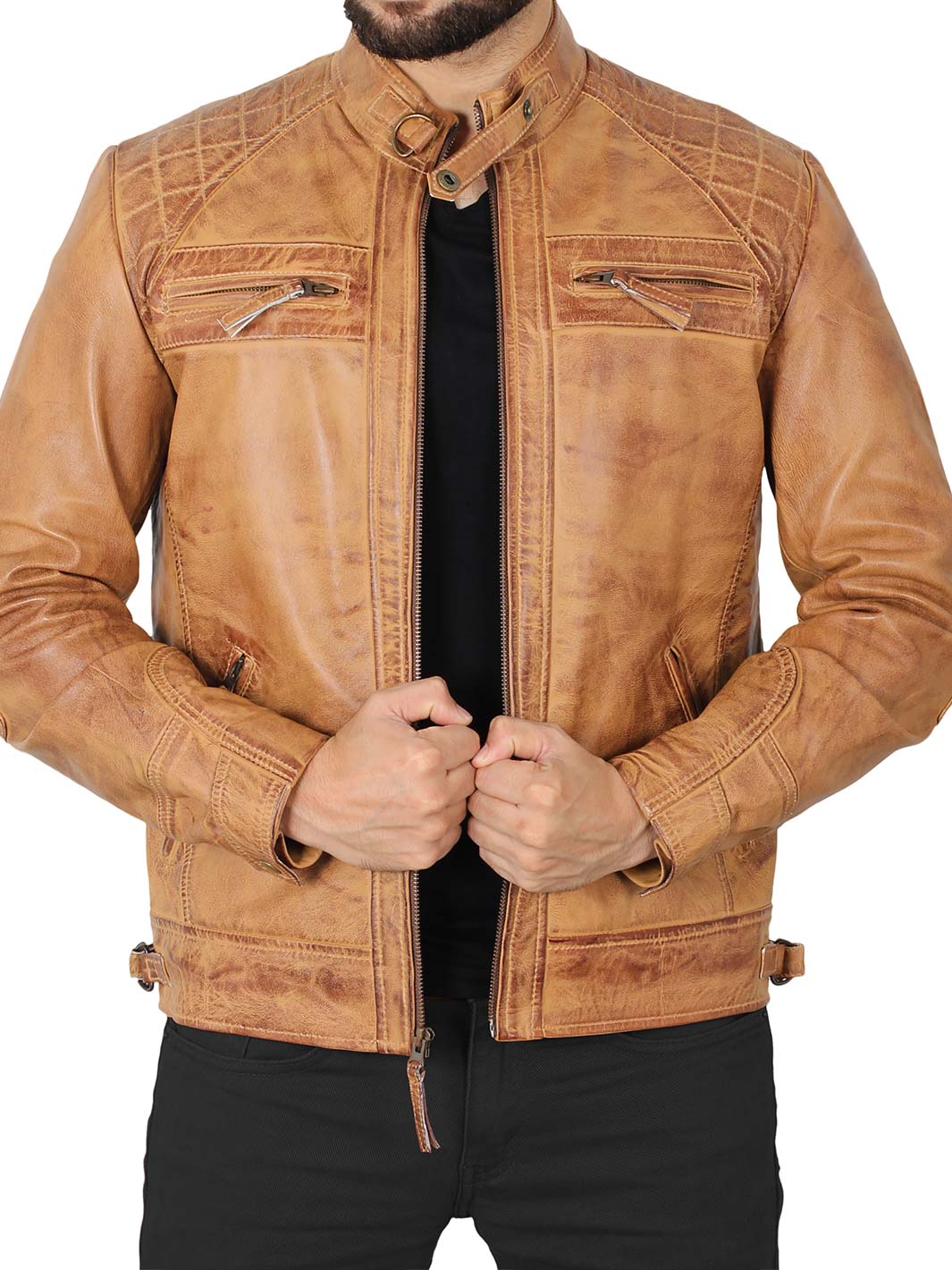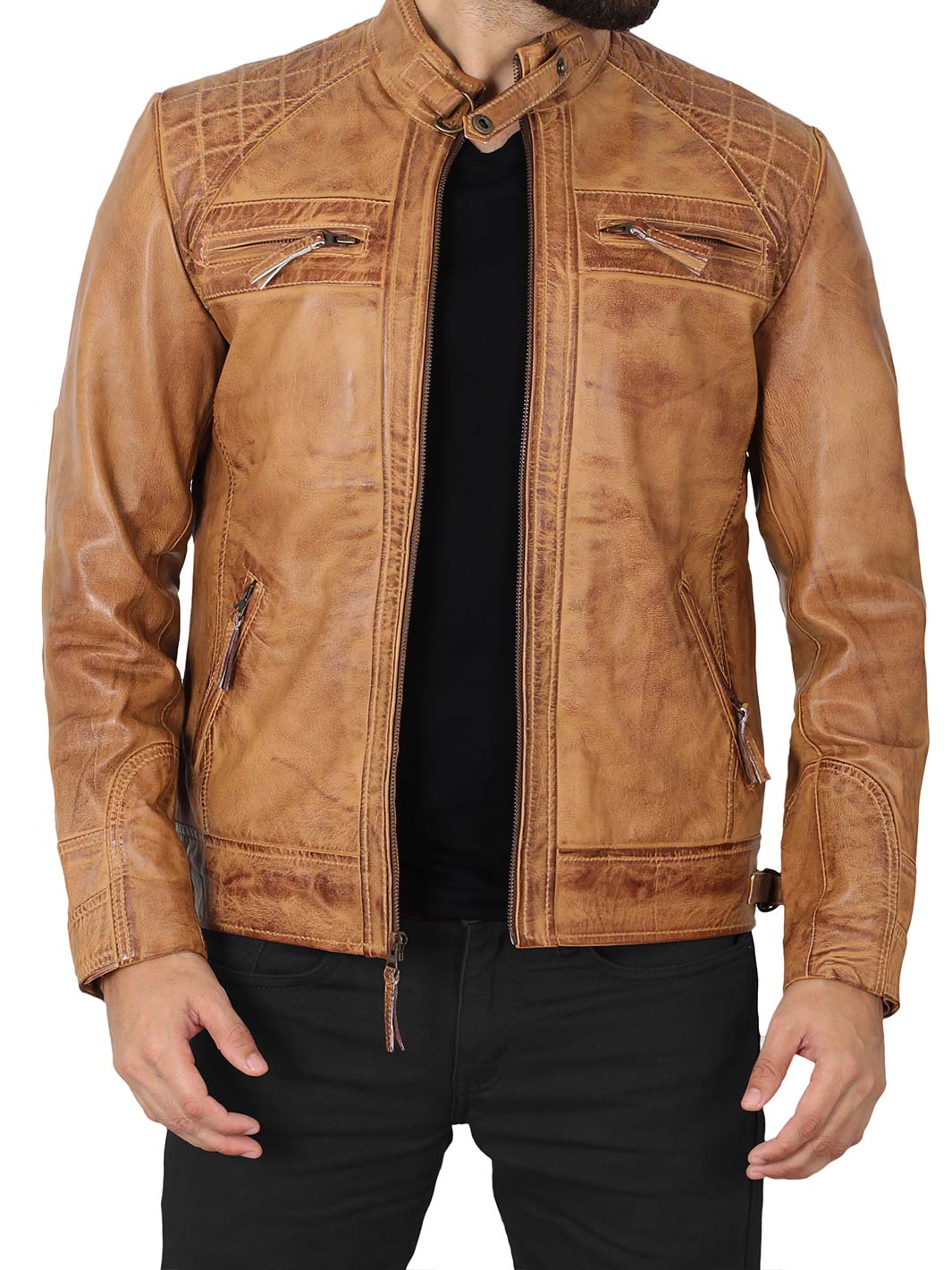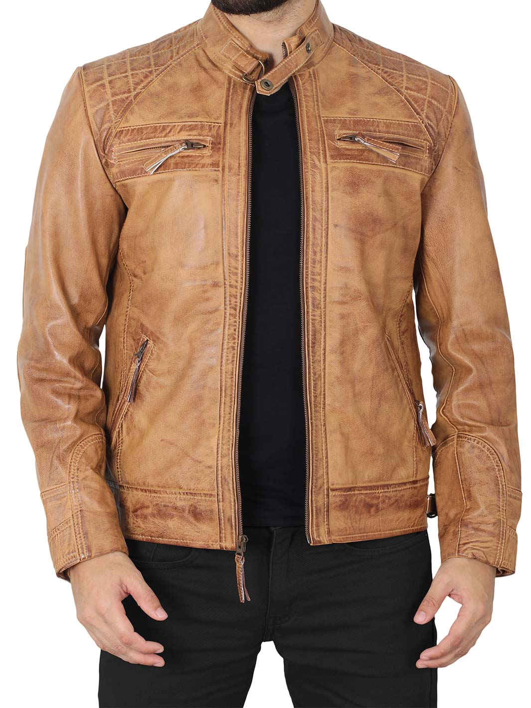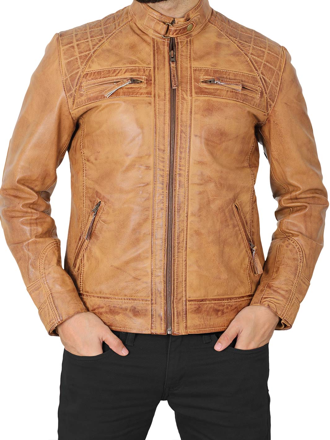 Ride in style with the Diamond Men's Camel Motorcycle Jacket, made from 100% real lambskin leather. It features quilted shoulders, a strap collar, and a YKK front zipper for a structured biker look. With adjustable cuffs and waist, plus multiple pockets inside and out, it’s built for both comfort and function.
