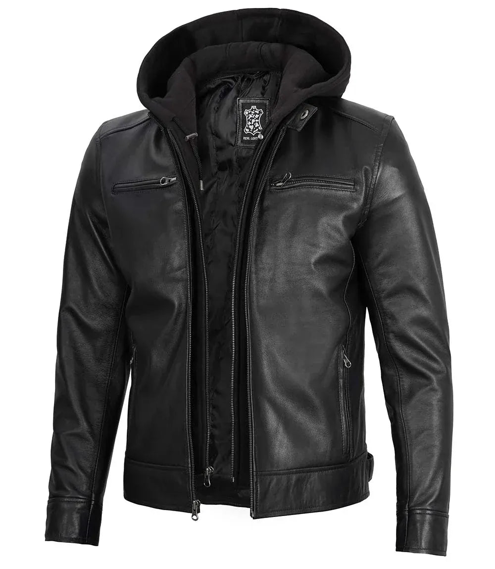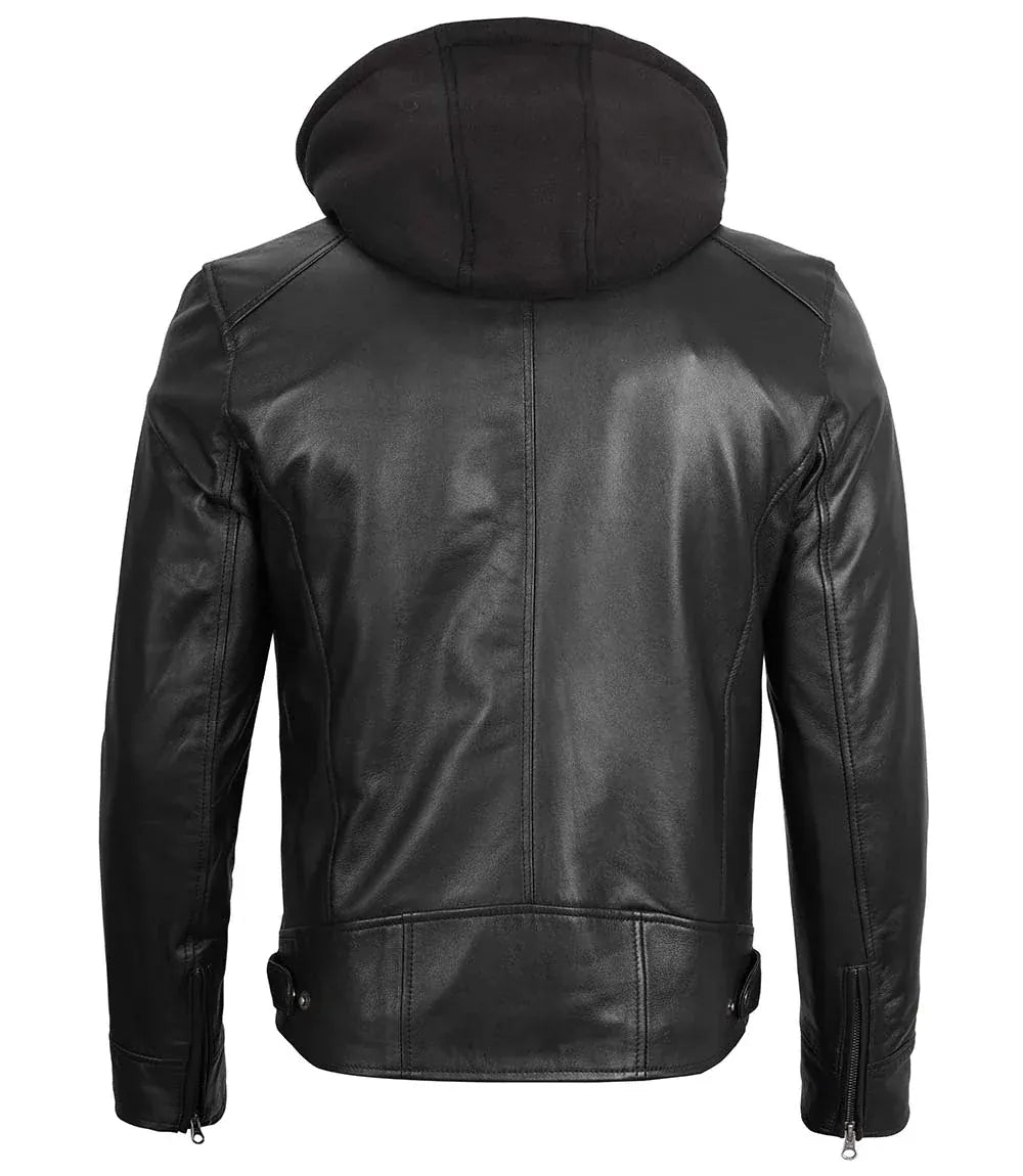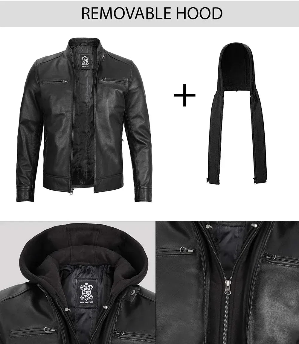 Men's Black Biker Style Leather Jacket with Removable Hood