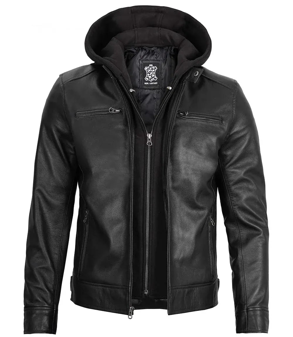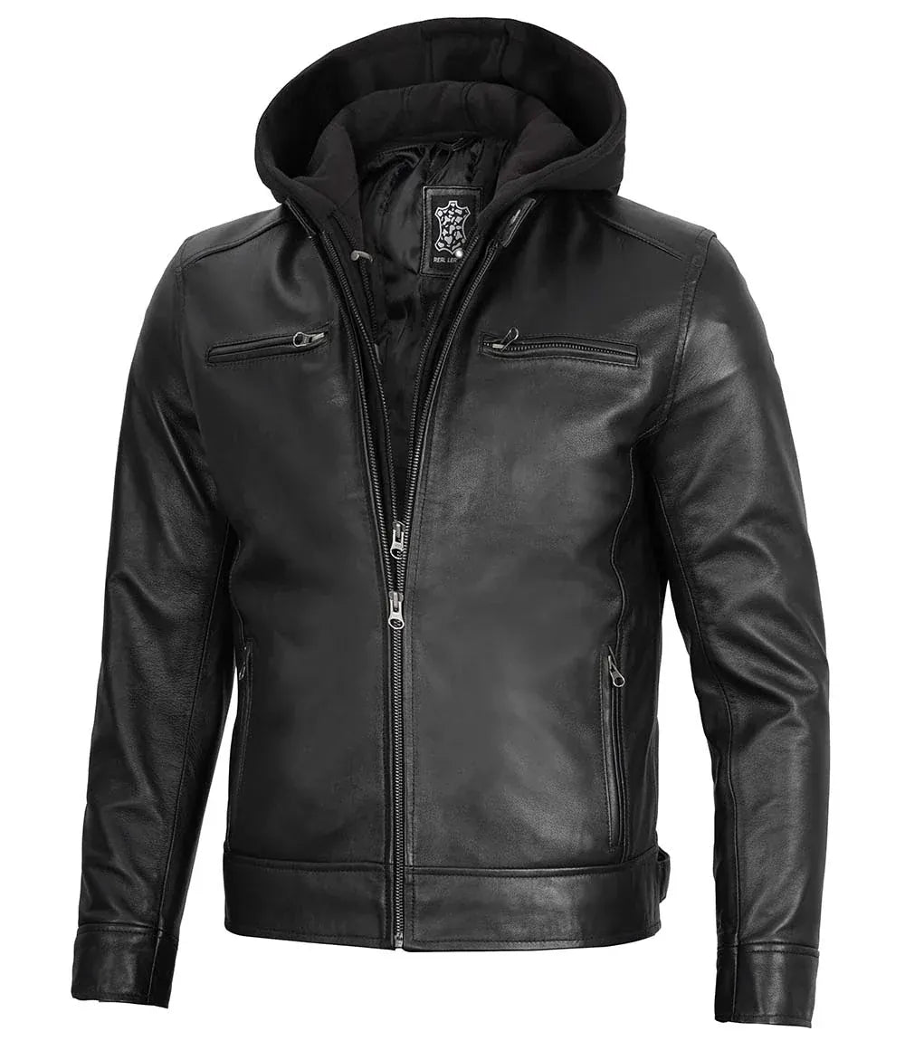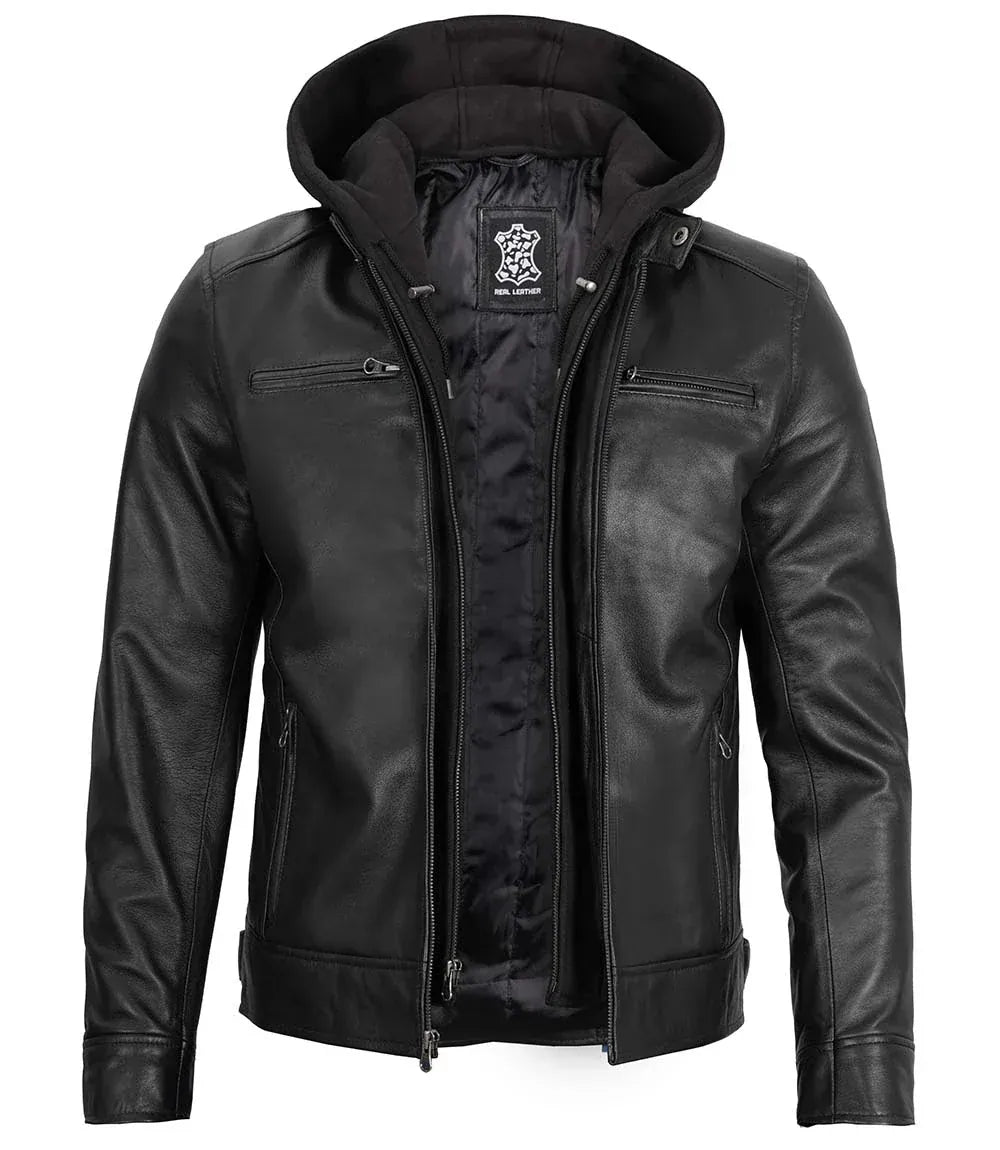 Men's Black Biker Style Leather Jacket with Removable Hood