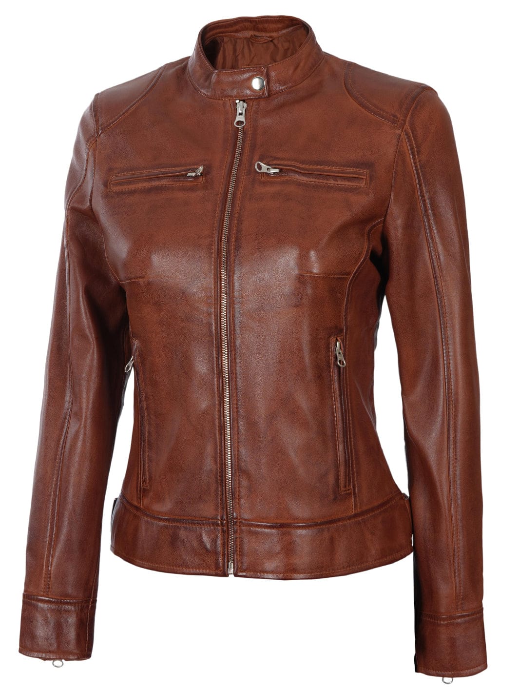 Dodge Womens Cognac Brown Biker Style Leather Jacket