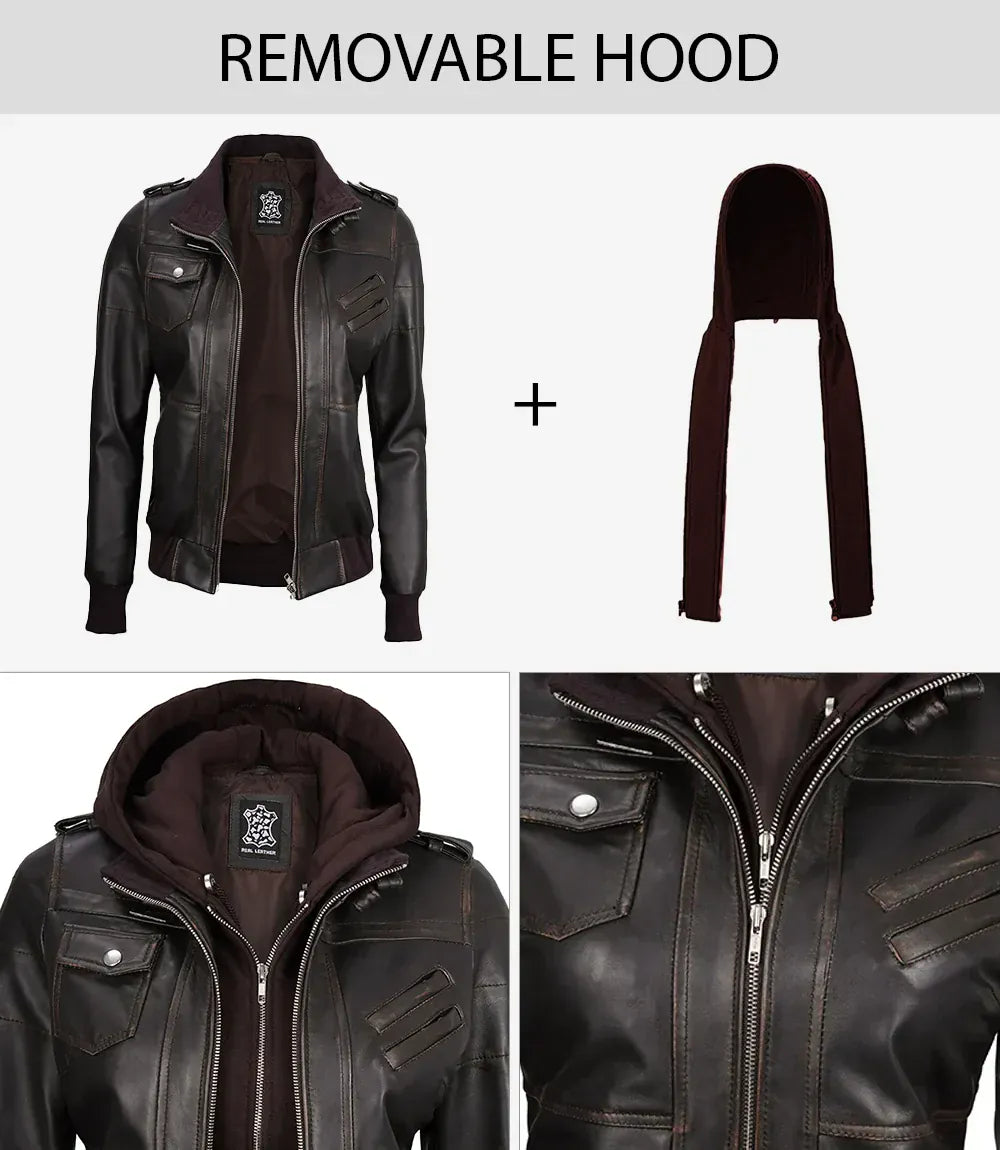 Women's Dark Brown Rub Off Leather Jacket with Removable Hood