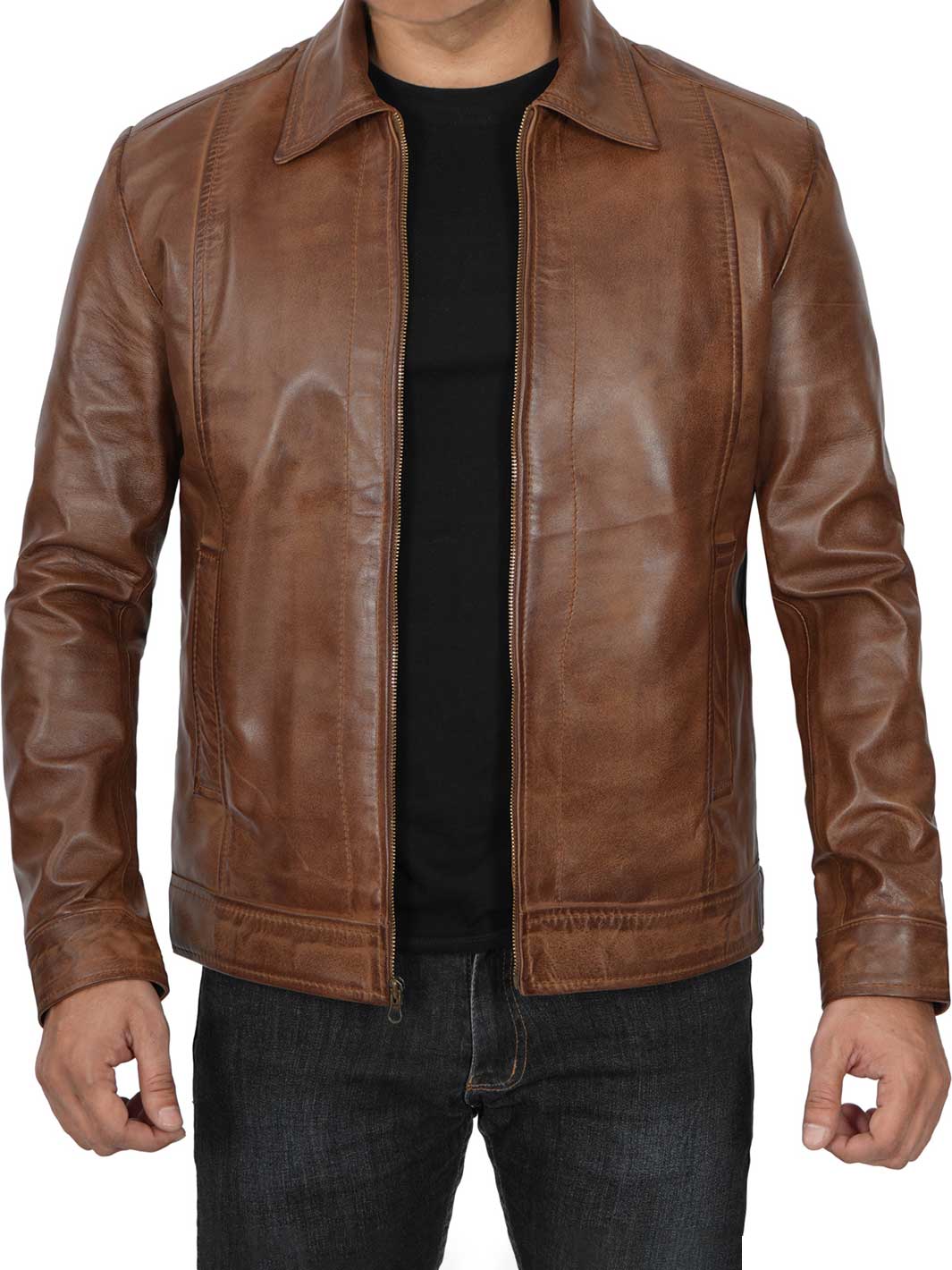 Mens Shirt Collar Chocolate Brown Leather Jacket