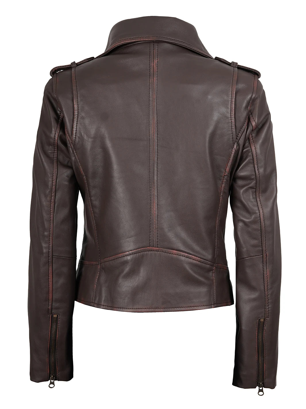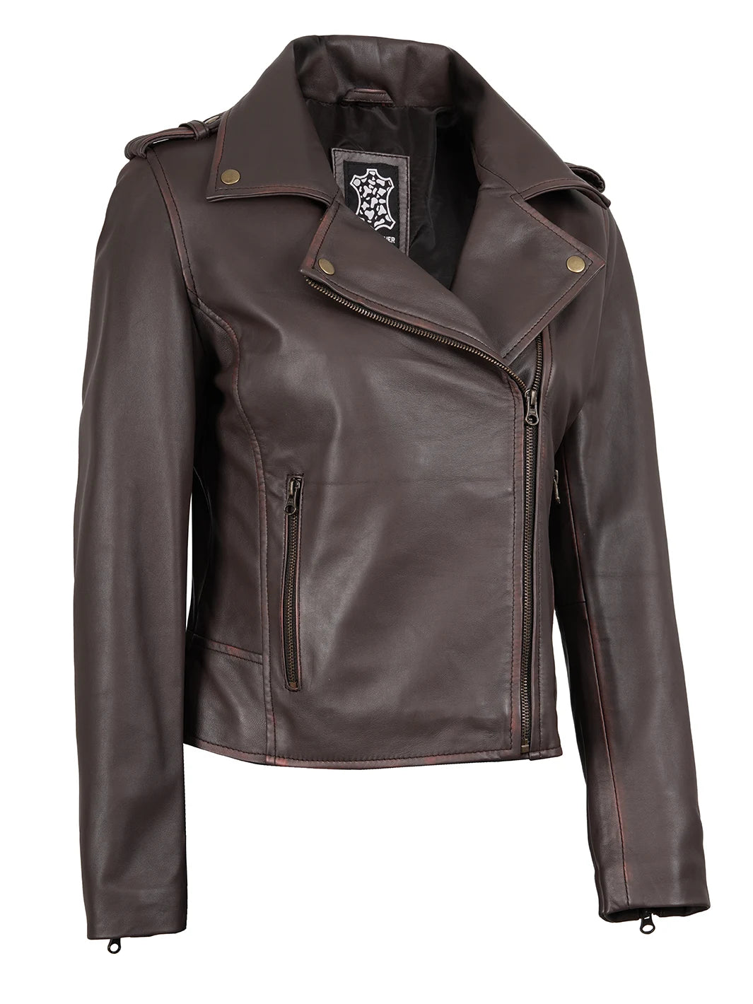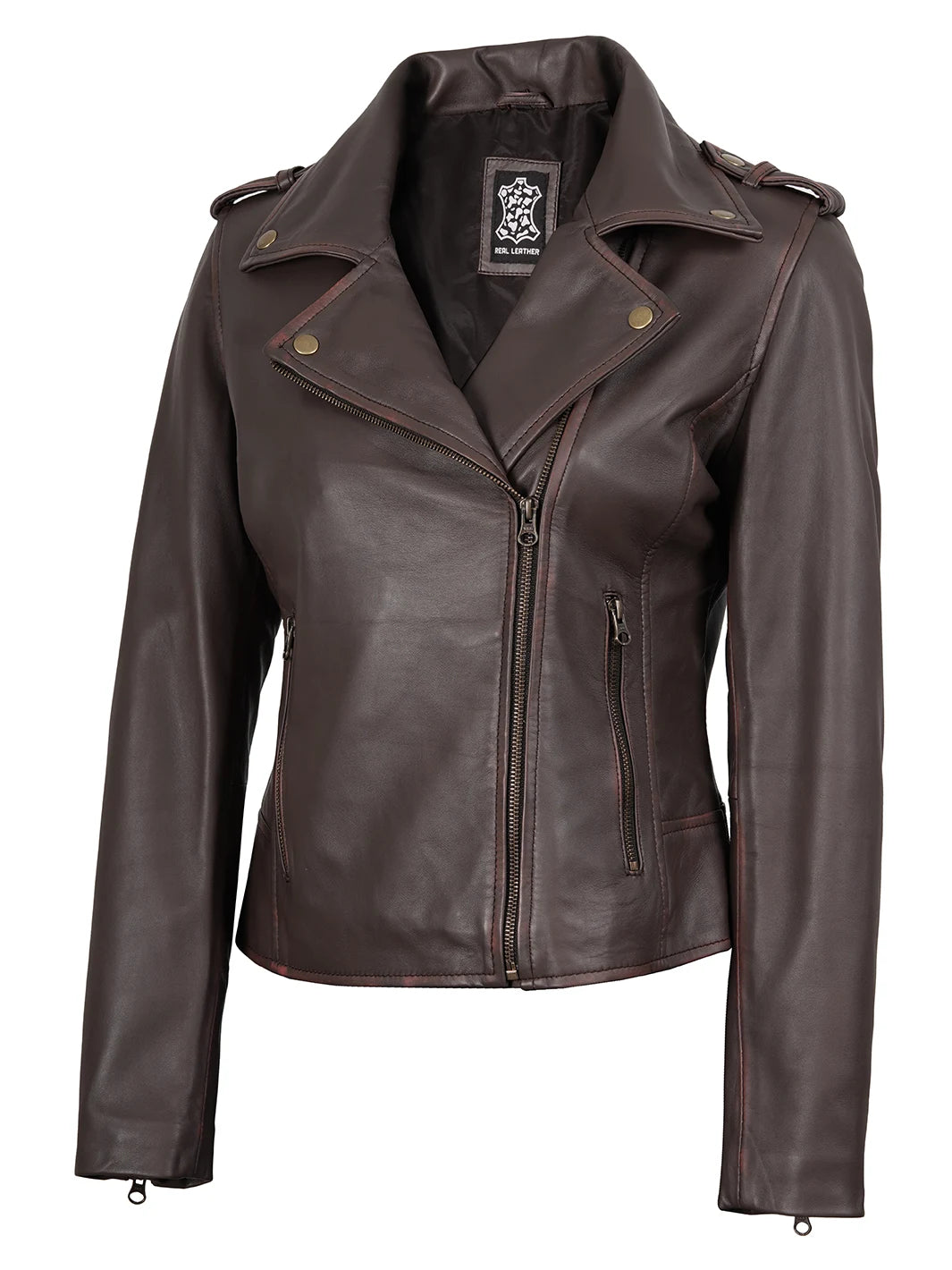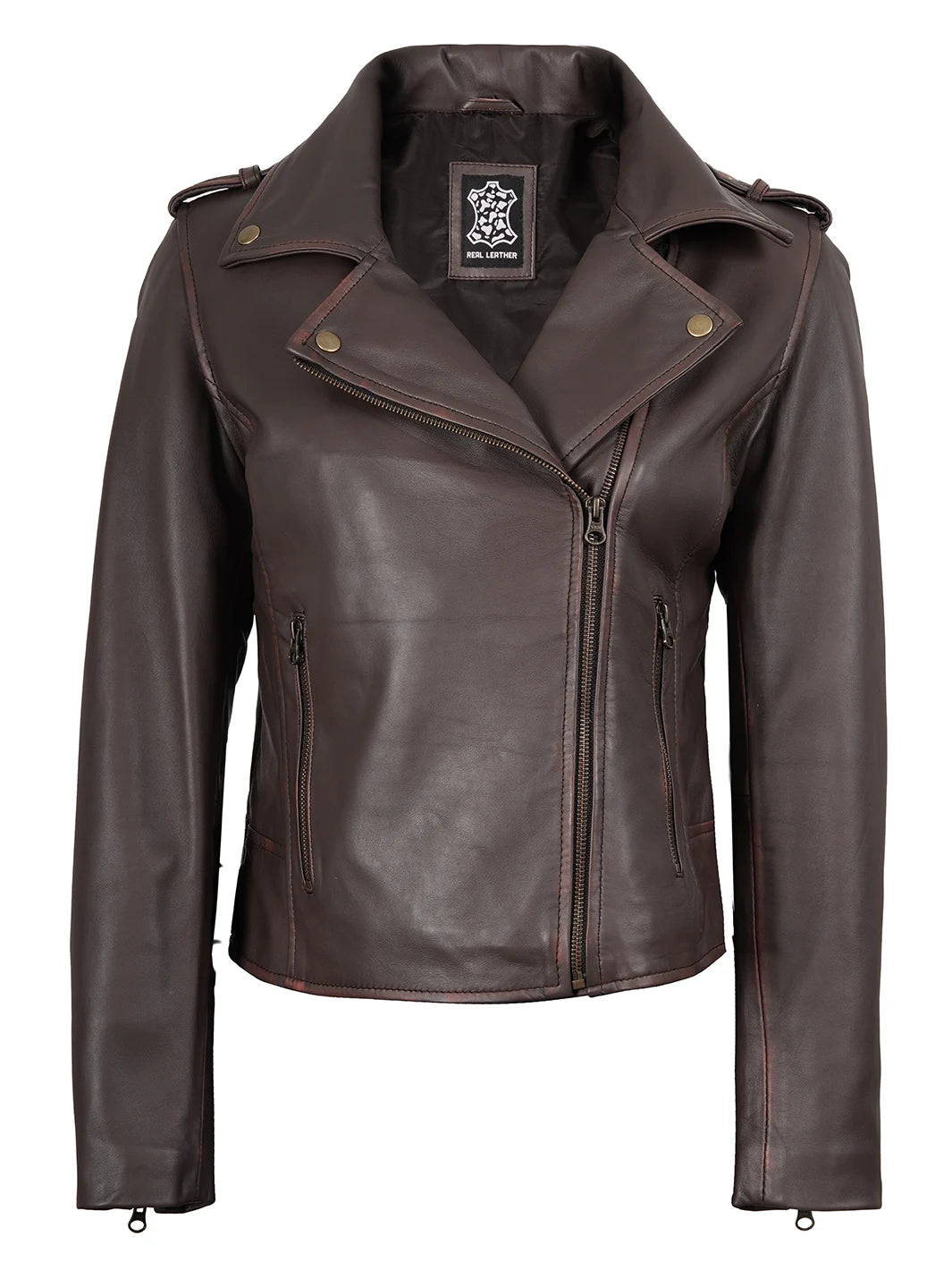 Unveil your edgy side with this dark brown asymmetrical leather biker jacket. Its vintage finish and contemporary design make a style statement. Made from real leather, it offers durability and comfort. Perfect for rides or casual outings, it's a must-have for fashion-forward women.