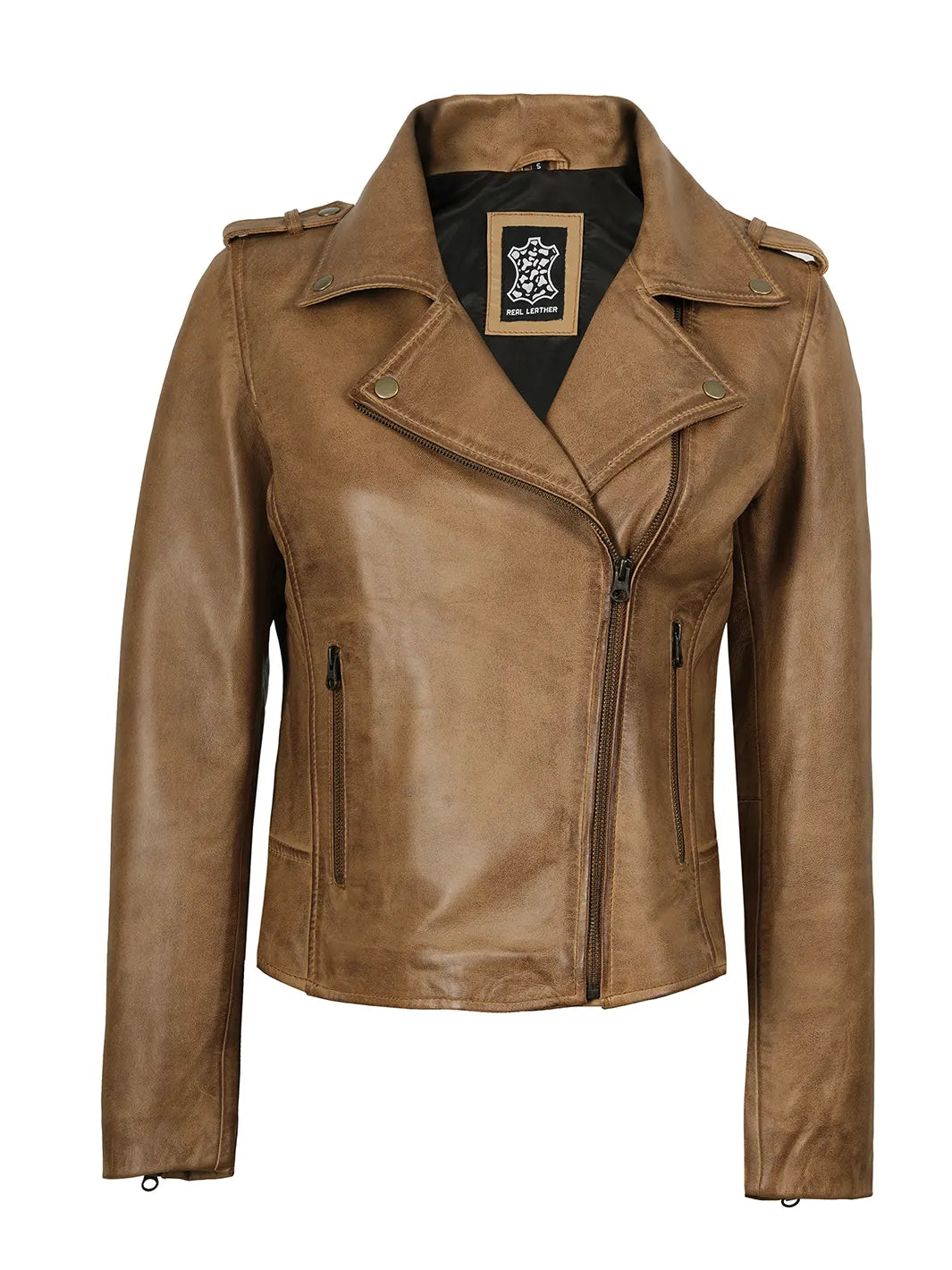 Kirsten Womens Asymmetrical Camel Brown Biker Style Leather Jacket