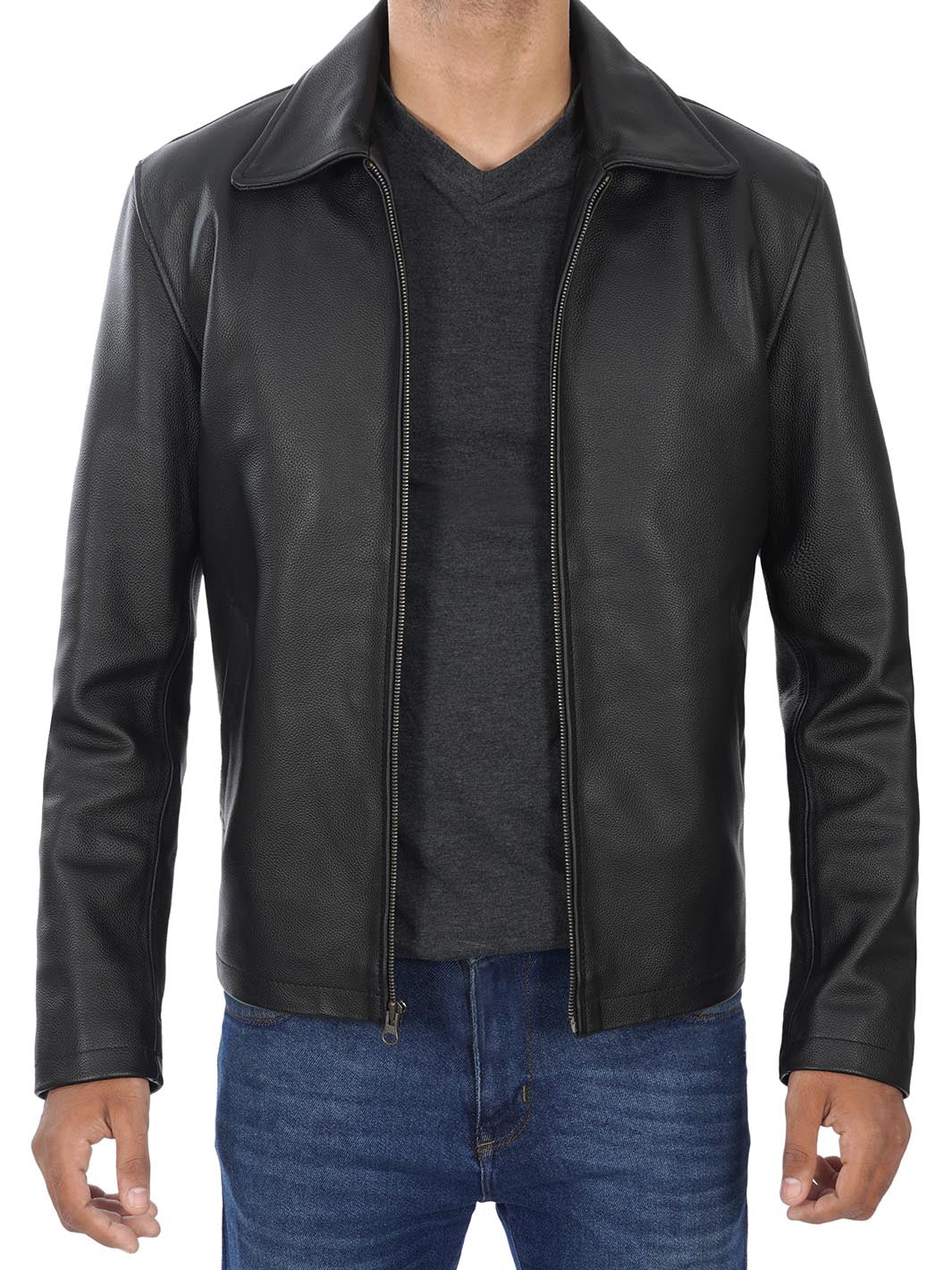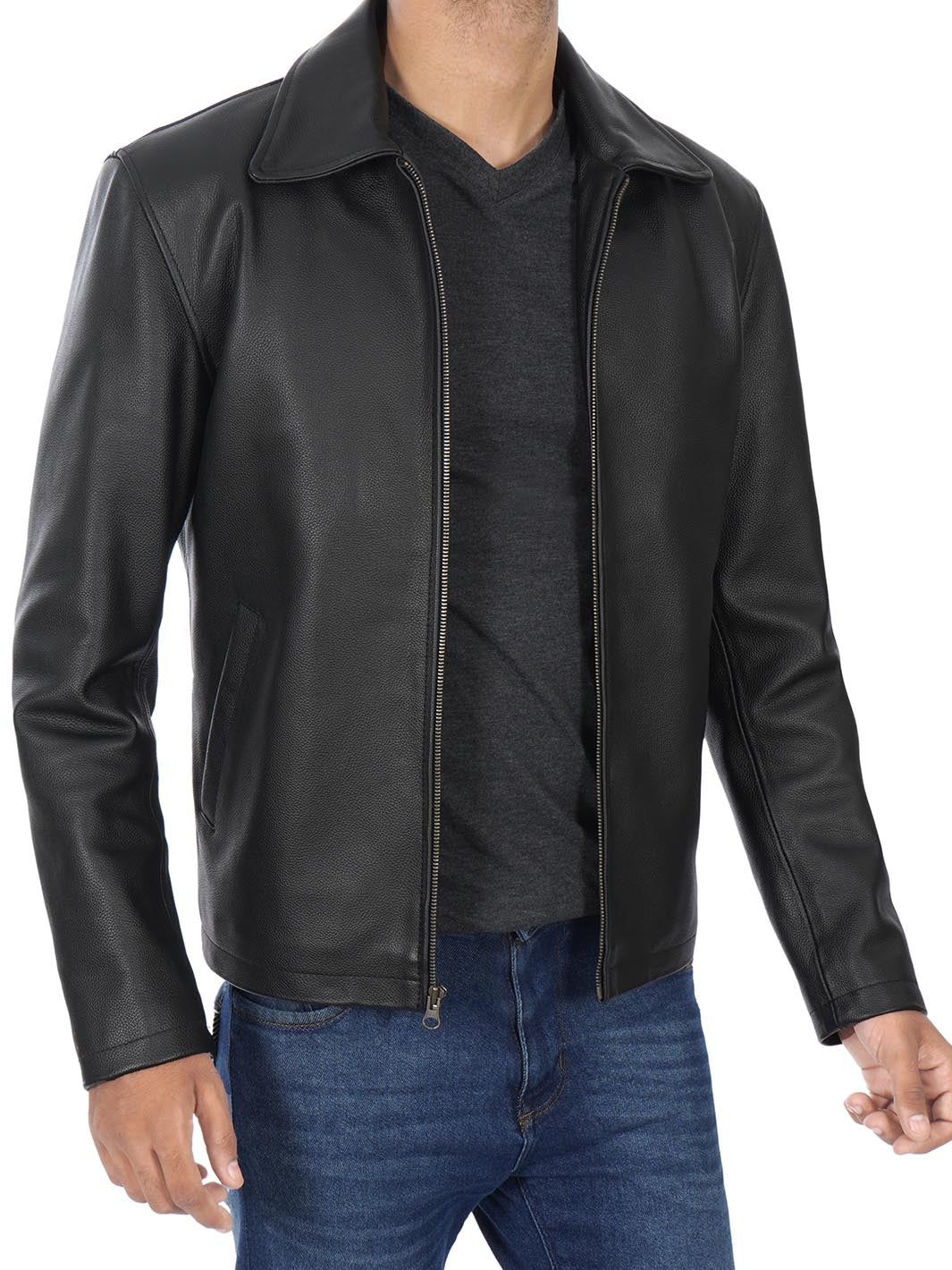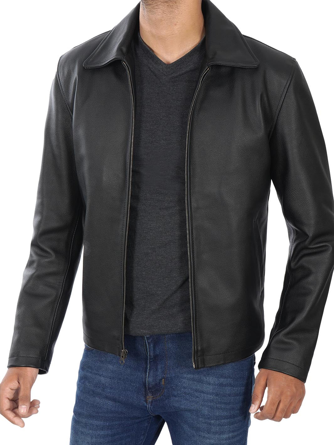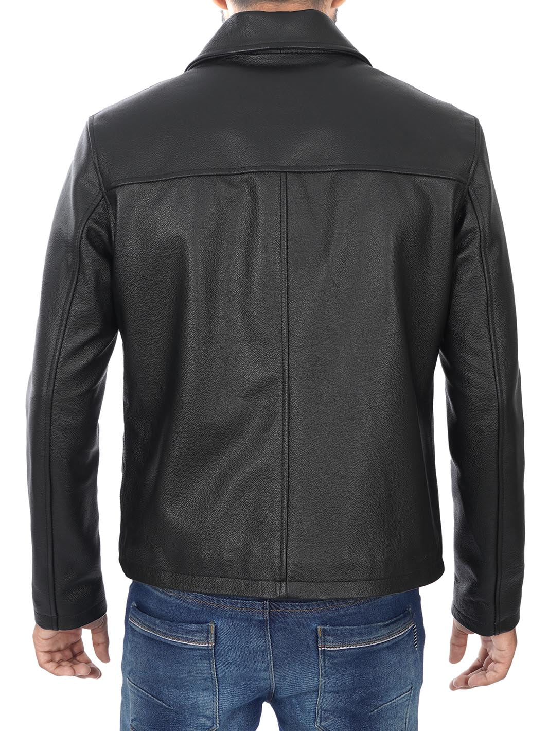 Men's Black Shirt Collar Cowhide Leather Jacket
