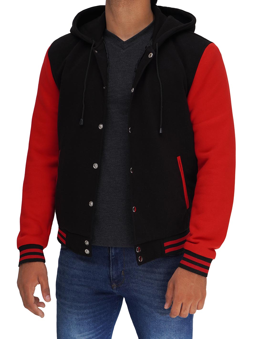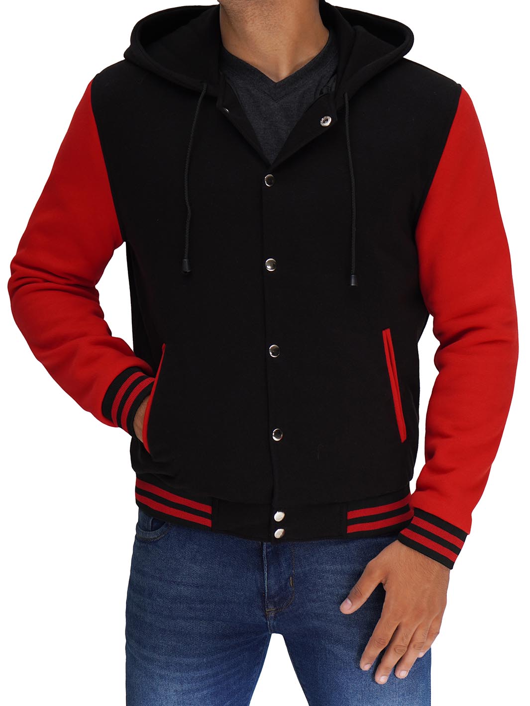Revamp your wardrobe with our Men's Red and Black Varsity Jacket with Hood, accentuated with striking details. This jacket takes the traditional varsity style and elevates it with a contemporary hooded design.