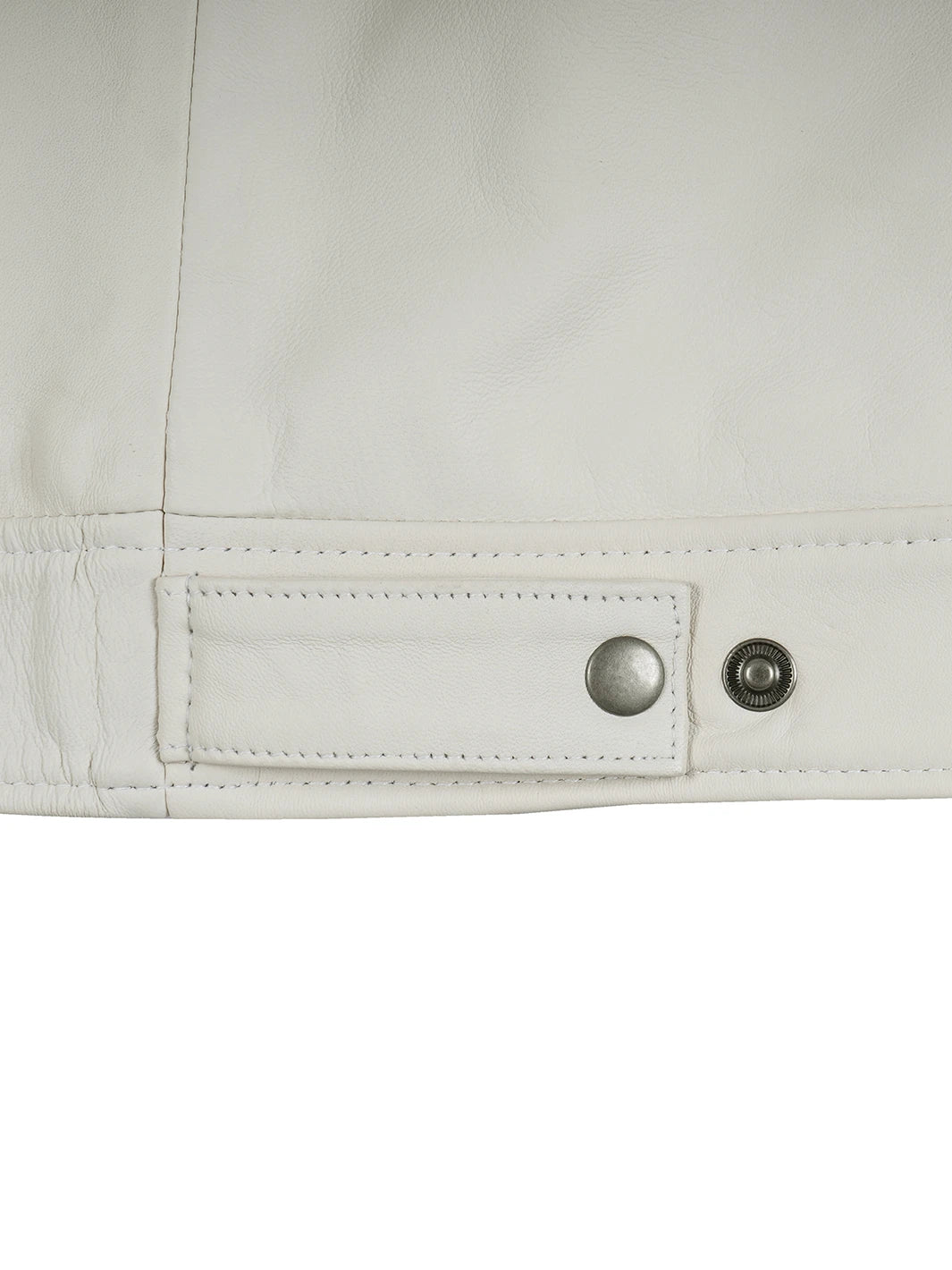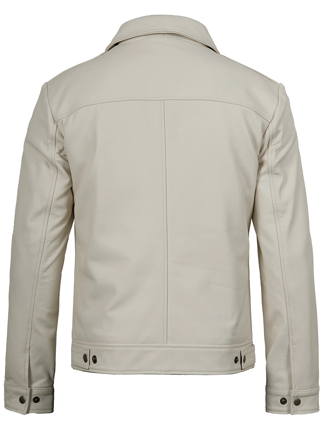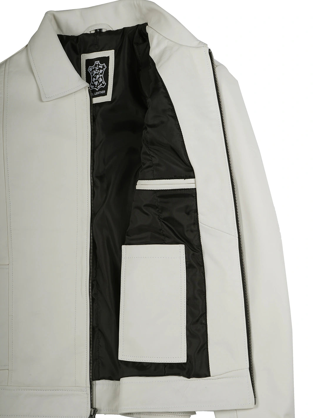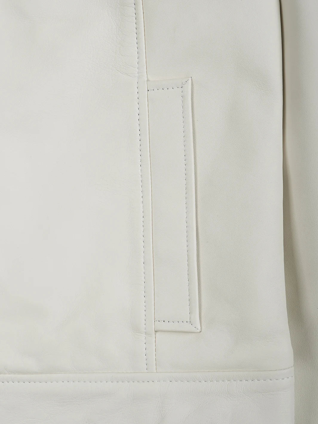 A sleek Harrington jacket crafted from 100% real lambskin leather in soft off-white. Featuring a shirt-style collar, zipper closure, and two exterior plus two interior pockets—including a dedicated phone pocket—for practical, everyday wear. Smooth and stylish, it offers a modern twist on a classic design.