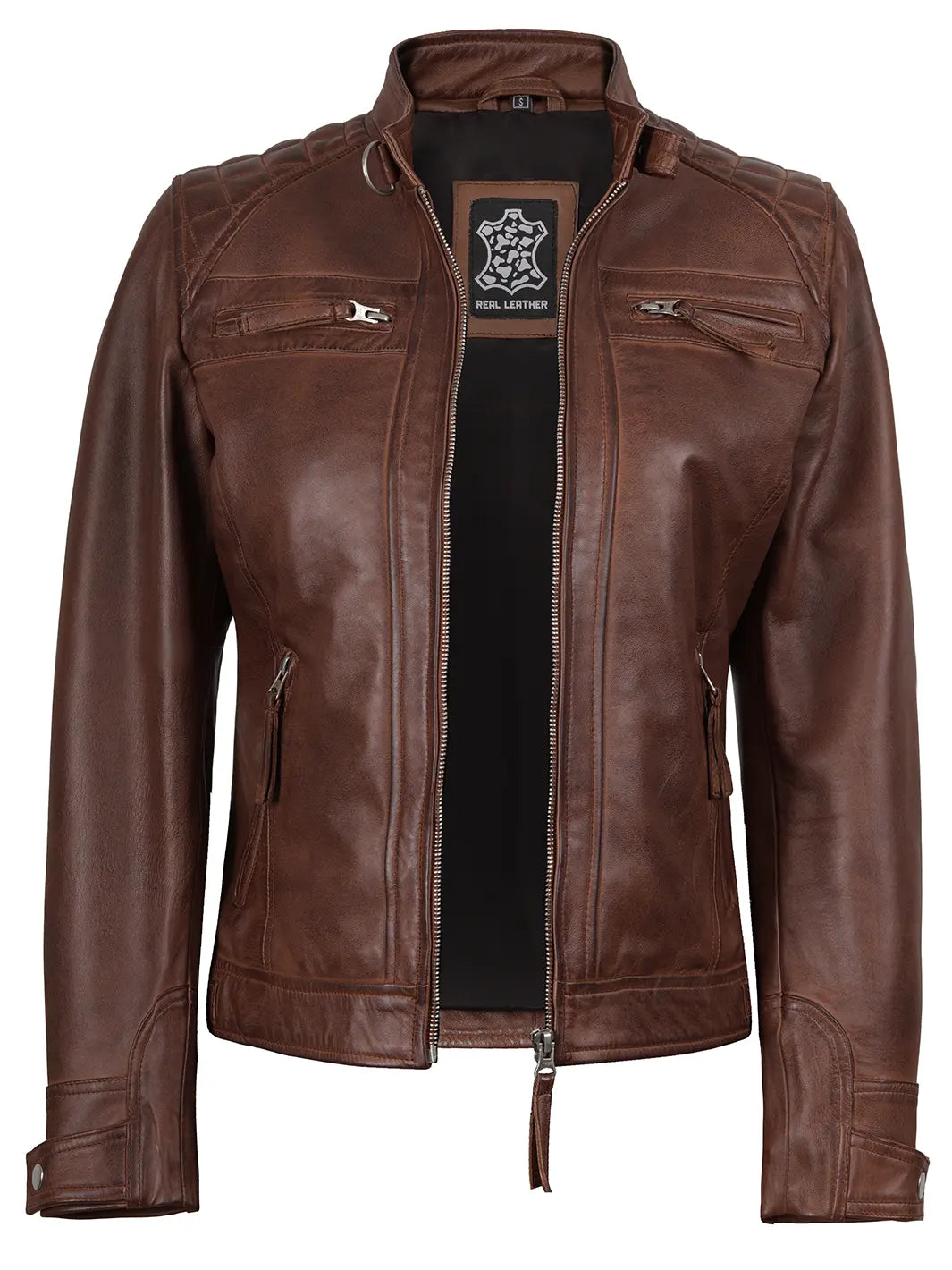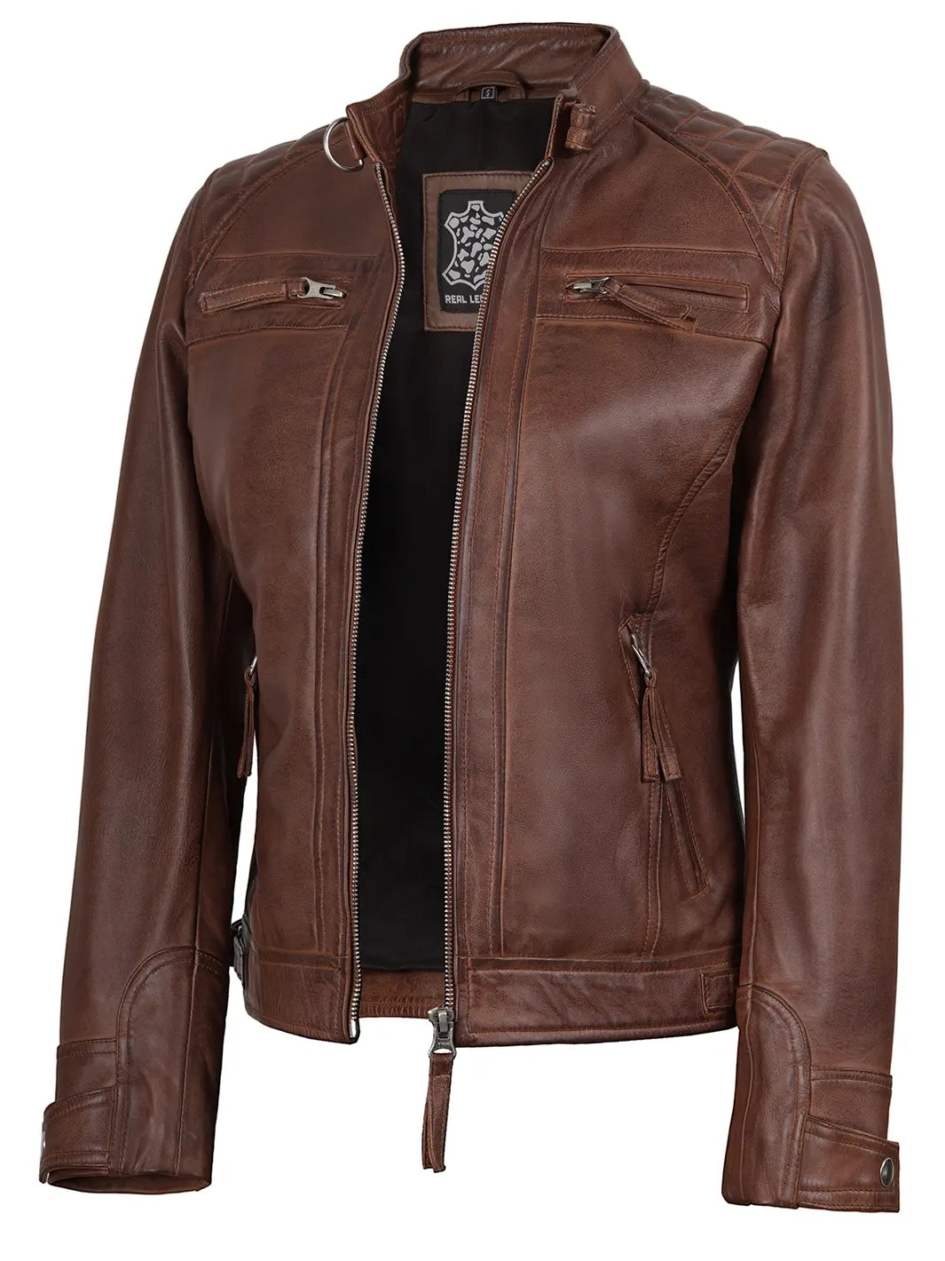 Johnson Women's Cognac Brown Cafe Racer Style Leather Jacket