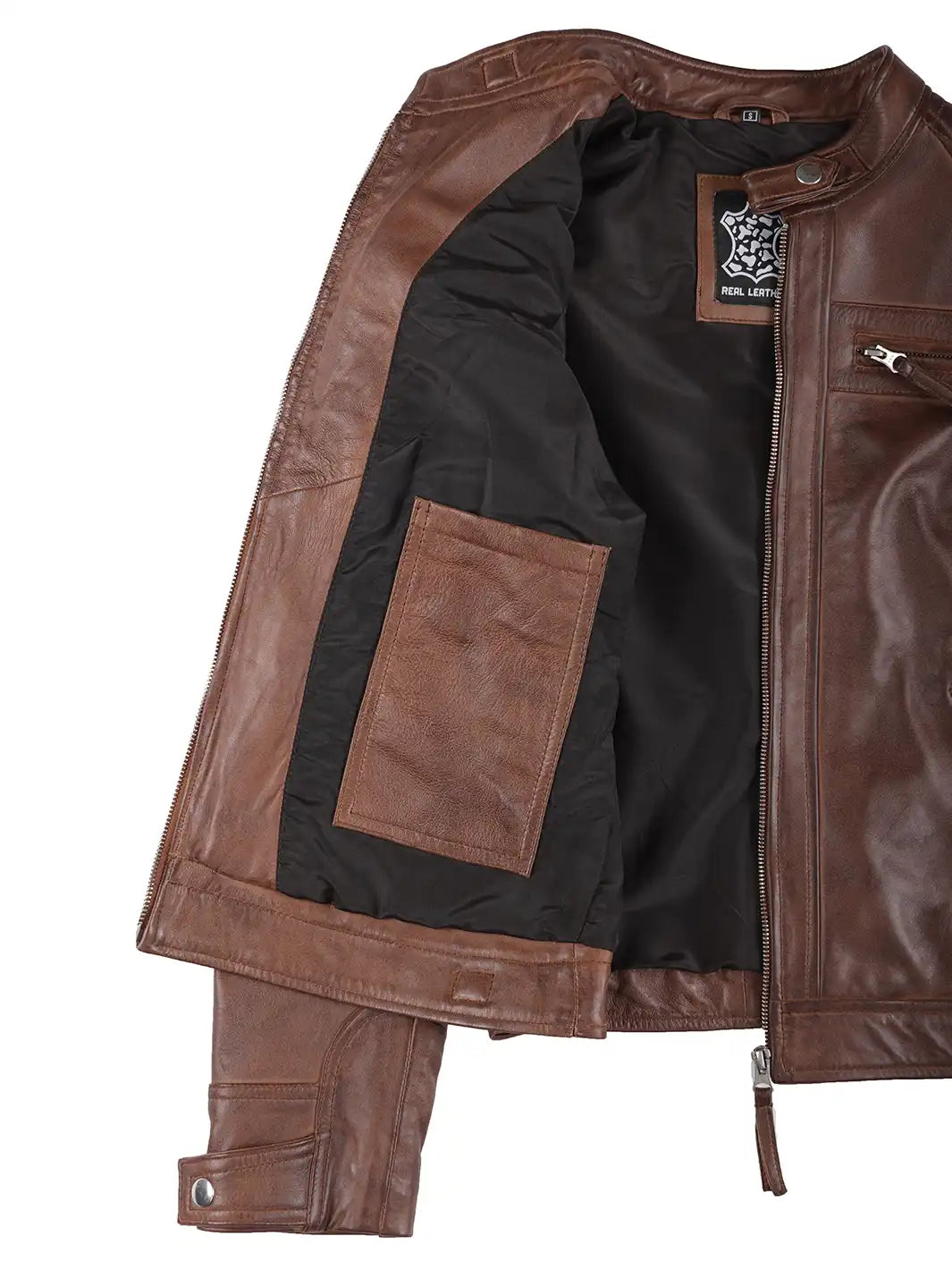 Refine your look with the Cognac Brown Cafe Racer Style Jacket, featuring detailed shoulder quilting and a smooth zip front. Made from real lambskin with a rich cognac finish, it includes adjustable side buckles, snap cuffs, and ample pocket space. A sleek biker-inspired staple with comfort and edge.