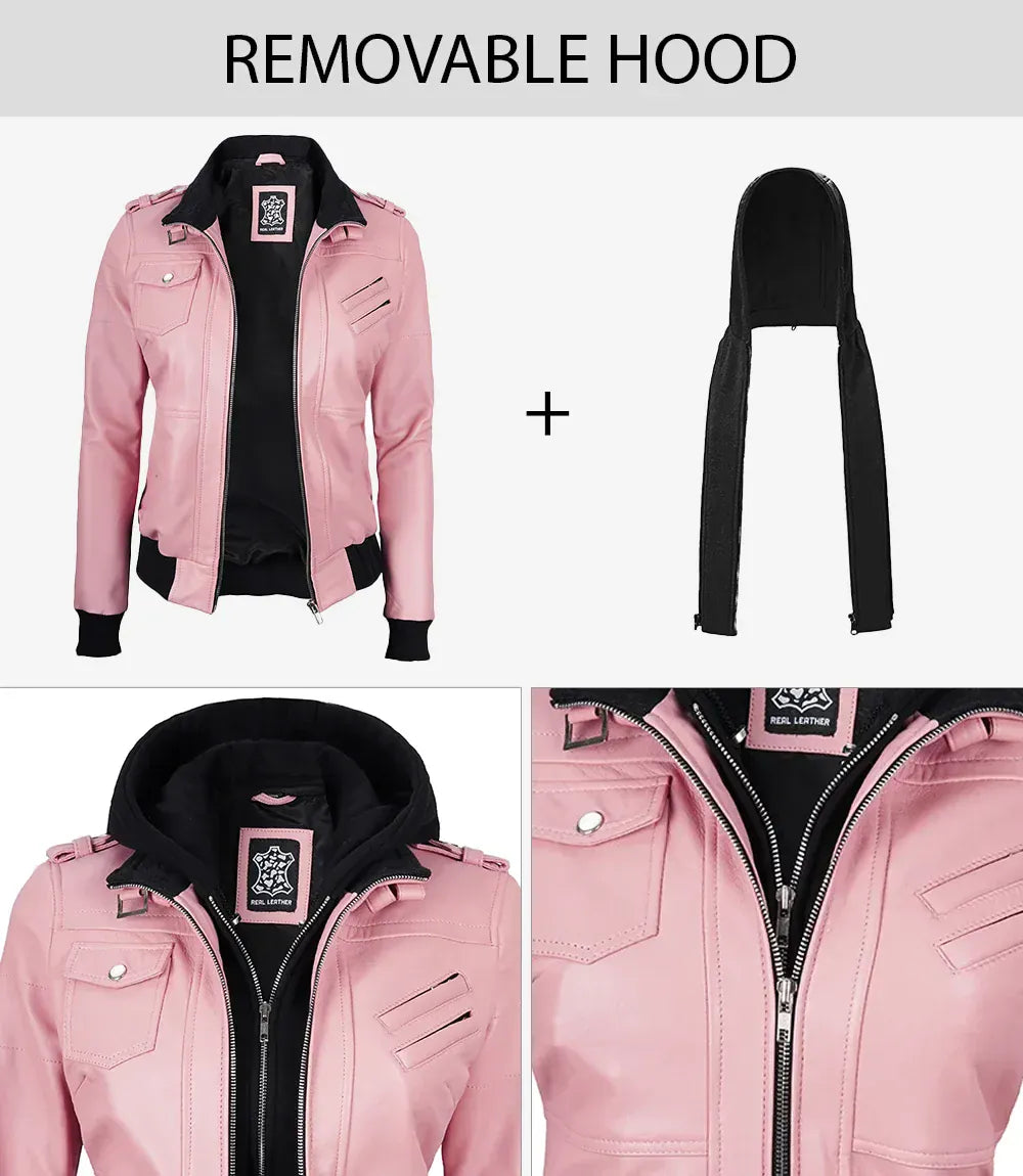 Brighten up your wardrobe with this chic pink hooded leather jacket, crafted from real lambskin for a soft, refined feel. Designed with a removable hood, shirt-style collar, and multiple pockets, it’s the perfect balance of fashion and function, ideal for both crisp mornings and stylish nights out.