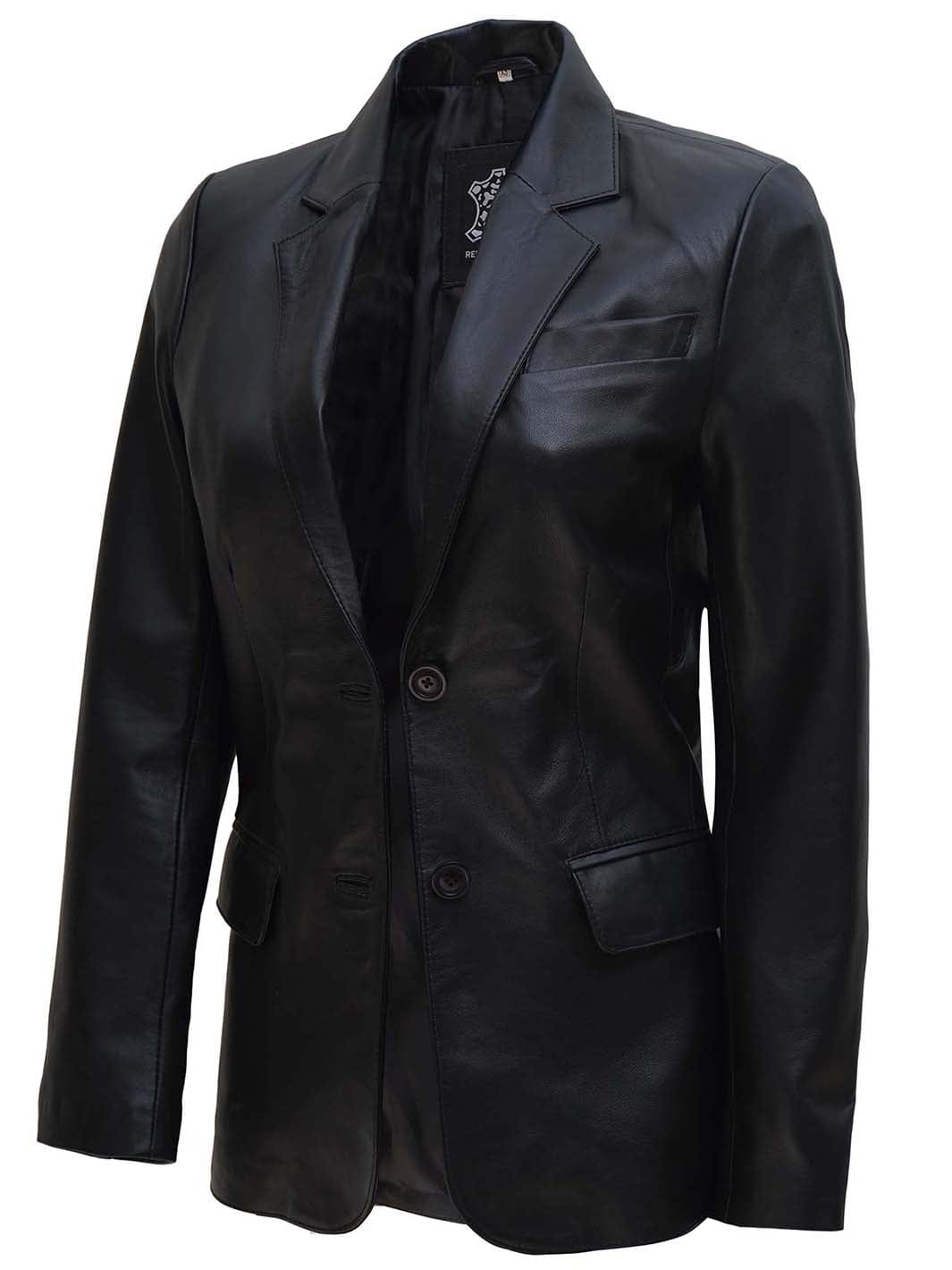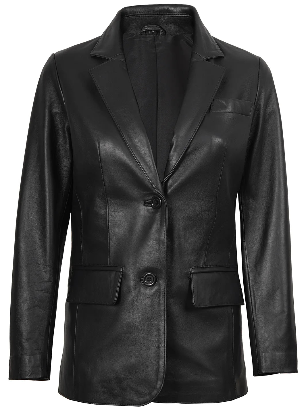Crafted from 100% real lambskin leather, it features a classic lapel and a sophisticated two-button front closure. Designed for semi-formal wear, this blazer offers practicality with three exterior pockets and two interior pockets, including a dedicated mobile pocket. A timeless piece in essential black.